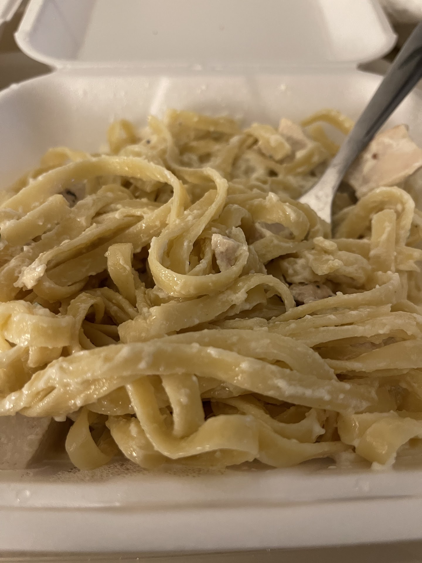 My daughter's fettuccine alfredo looked terrible. It was just warm, but looked like it was made yesterday and just warmed up in a microwave. I'm a pretty good cook and I make Alfredo from scratch often. It's super easy to do and always turns out creamy, not clumpy. It's only clumpy after being cooled and then not warmed up properly, which I'm 90% sure happened here.