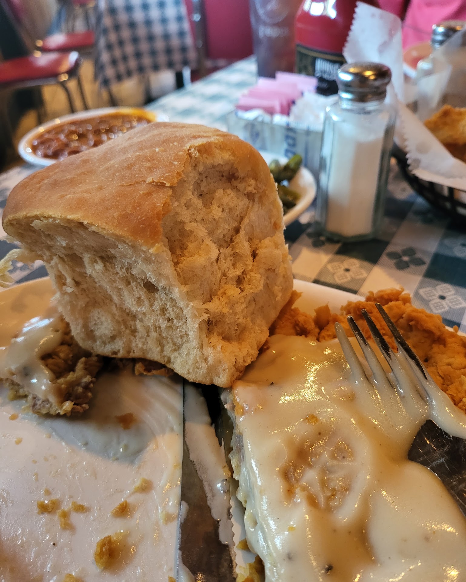 Read moreThe service early on a Friday evening was quick and friendly, with no delay in seating or serving. Kylie was our server; the drinks and food came very rapidly, my beer was served cold in the bottle, and coffee was also served immediately. I was surprised at how quickly the food was served, but disappointed in the quality. I had the ribeye, mentioned on the specials board in the waiting area. I asked for two carbs, mac ‘n’ cheese and a loaded baked potato. The mac tasted very premade, with none of the qualities of homemade. No brown cheesy crust, no baked-together goodness, just yellow cheese sauce on small pasta. The baked potato was fine, but not very hot. The bacon bits tasted and looked like they came from a packet, not like anyone was frying actual meat. The ribeye was thin and stringy, with a lot of fat and tough fibers, but they did cook it close to medium rare, which is quite a task with such a thin cut. The gravy and rolls in a basket also appeared to be just something shipped in and heated, maybe canned gravy? My companion had the meatloaf, which she said tasted like it had spaghetti sauce on top. The beans looked canned as well, and there was a scoop of ordinary mashed potatoes. We ordered banana pudding to go, but I’d pass next time. It seems to be mostly whipped cream and not really the creamy thick dish with bananas and wafers I was hoping for. On the whole, all seemed very old-fashioned and plain, with none of the local color and style we’d hoped for. Maybe it’s a good place to take the grandparents; we did see a large percentage of older folks who seemed happy with their choice. The religious bent to the decor was echoed in the wishes for a ‘blessed day’ we were offered by...