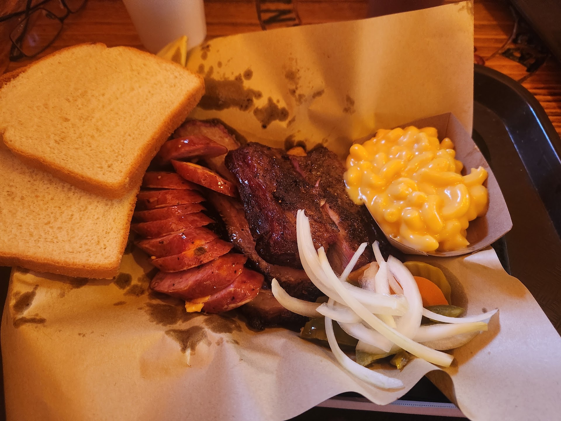 My partner and I ordered 2 dishes, the 2 meats and 2 sides which was about ~$15.00. We got the sausage, brisket, ribs, mac and cheese, beans and fries- bread was also included. To drink, we got a lemonade and a bottle of Dr. Pepper.