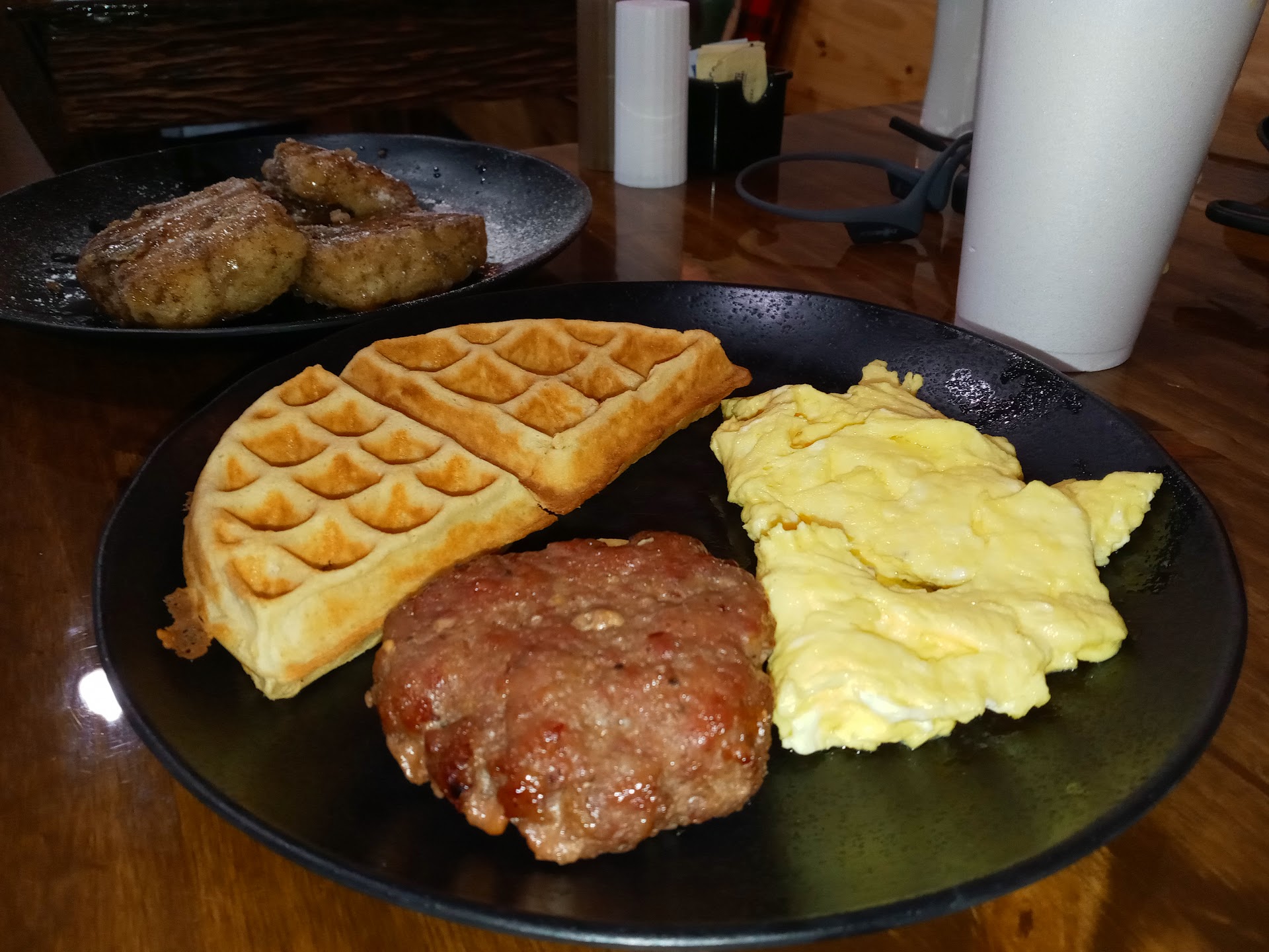 My friend got the Biscuit & Gravy - 2 Savory Buttermilk Biscuits served with sausage gravy. He added a fried egg on the side. His wife also got the Mama Bear, but with a biscuit instead of a waffle.
