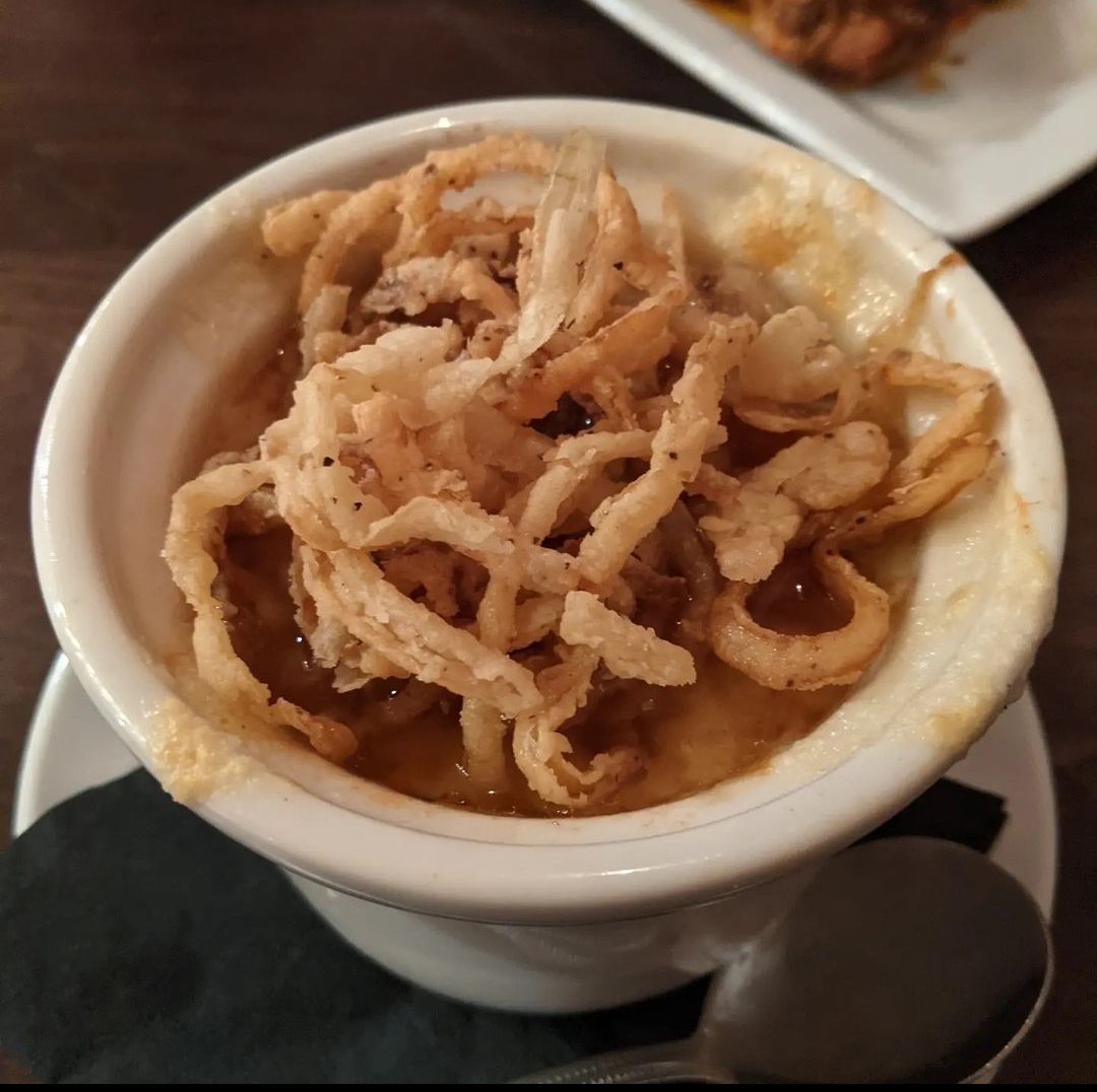 My main course was better. French dip. The baguette was crusty, the steak was thick and satisfying, which is different than the standard thin cut roast but still good, and the aus jus had the body and flavor that would have been nice to see some of in my first course. That being said, the fries were over cooked and hard. Oh well, just fries anyway. Nothing special, though I was under the impression they were going to be seasoned in some manner with herbs and cheese.