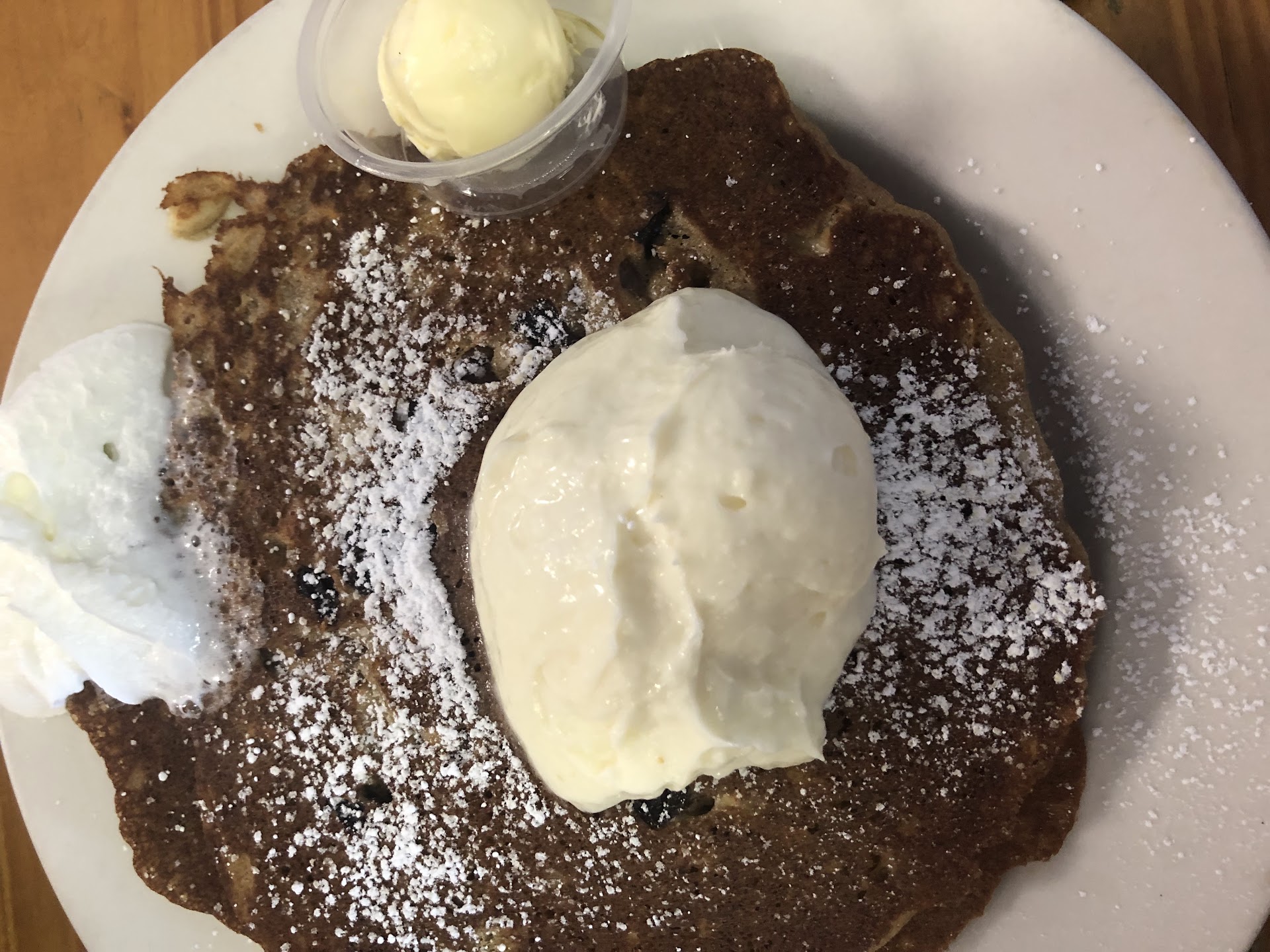 We ordered carrot cake pancakes to share and I had the C & G‘s omelette (add avocado) with extra crispy home fries and English muffin. Both we delicious and both were huge portions.