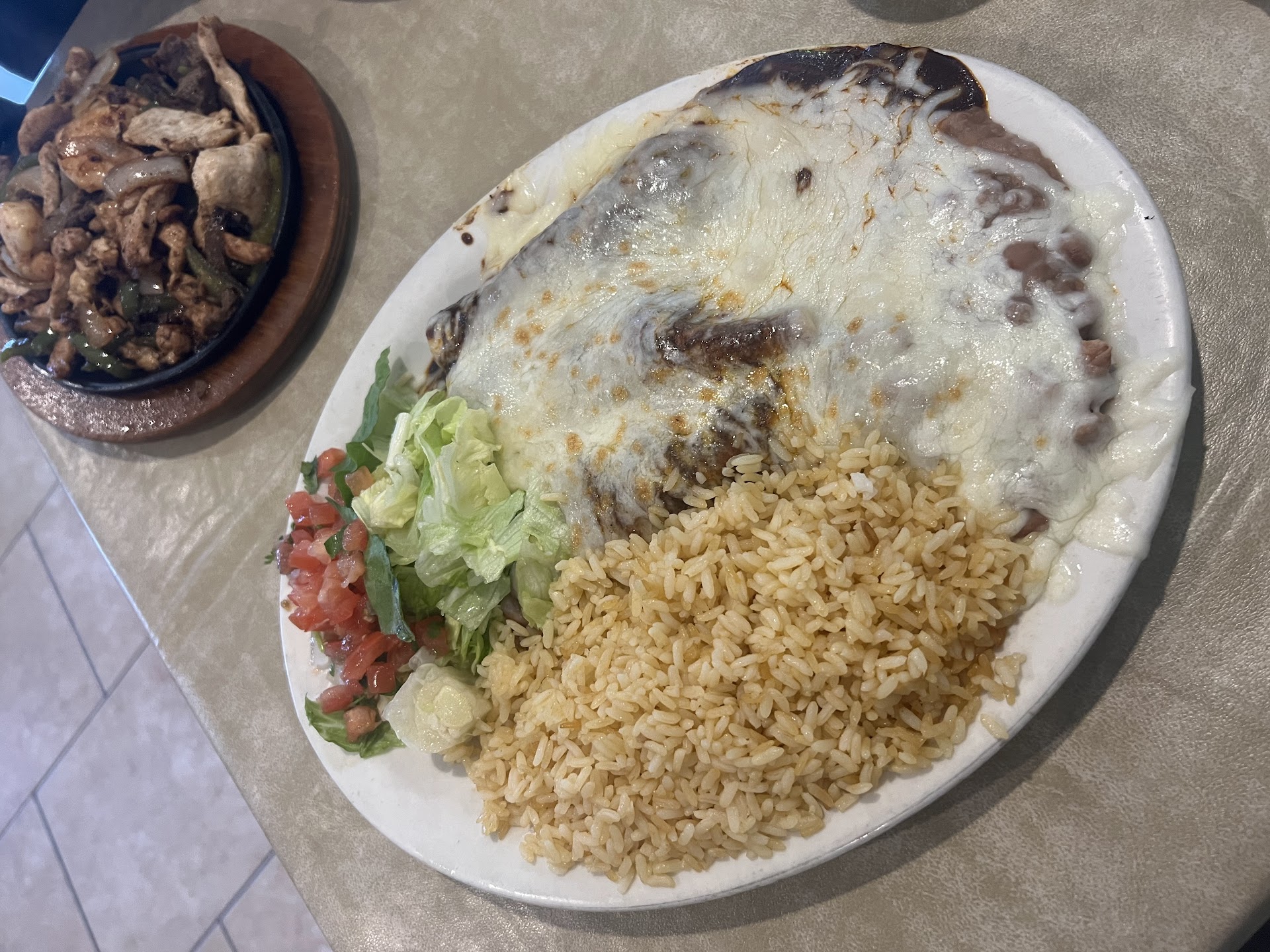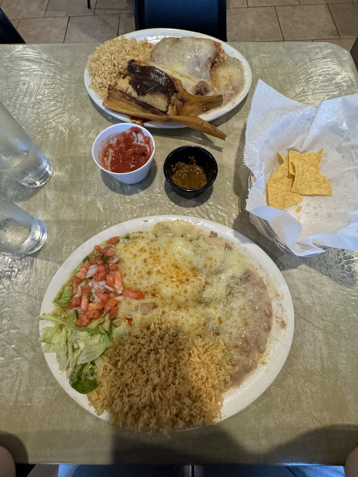 Went here for dinner Sunday night (9/1) and was sorely disappointed. Ordered guacamole, never received it. The salsa tasted like marinara sauce. Only had one silverware bundle and when I asked the waitress for another, she said she would bring it and then went out back, to the bathroom and then to the back of the restaurant, and we never received the silverware so my boyfriend had to grab one off another table. I ordered the enchiladas verdes and he ordered the mexican fiesta, and wow, disgusting. The food was flavorless and the enchiladas were doused in lime juice to compensate for how bland it was. The rice was dry and inedible. The verdes salsa was underneath the salad it came with and not on the enchiladas themselves. While the portions are large, it doesn’t matter if the food isn’t good. The waitress only stopped by once when we were almost done eating to refill our waters and after waiting another 15 minutes for the check I had to hold my card out over the edge of the table to get her attention. Would never come here again, subpar food...