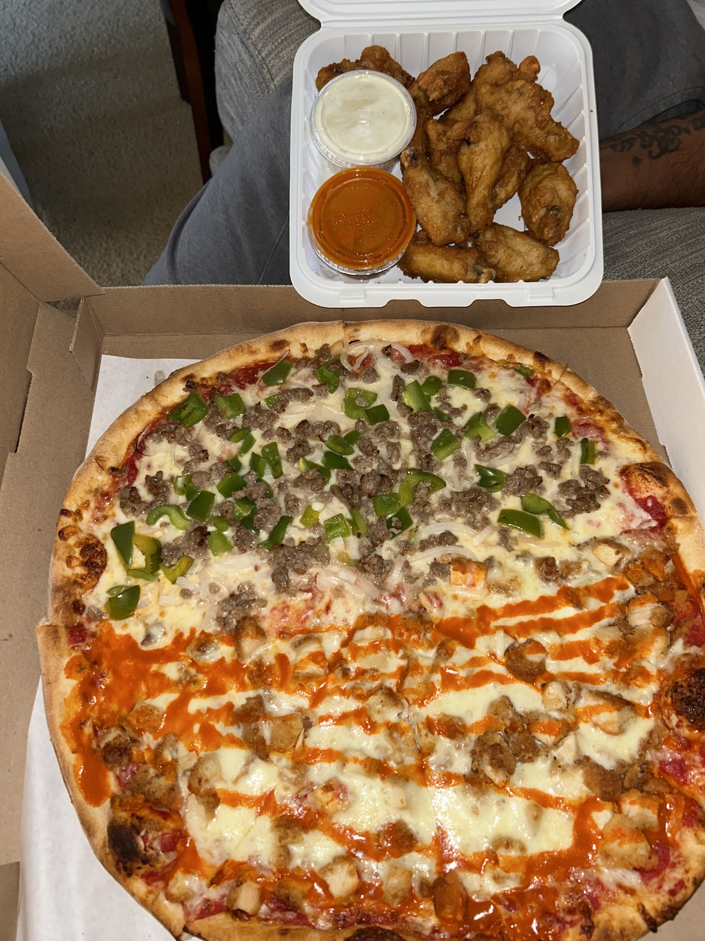 I have ordered here a lot, each time I think oh it will be better but sadly it’s not and each time I order here my stomach is very upset the next day no matter what I order. I have had wings, different pizzas and garlic knots. For an Italian place it does not taste Italian. The tomato sauce and wing sauce taste weird and not in a good way. I had buffalo chicken pizza once had chicken that had buffalo sauce on just the chicken and that’s it. Normally there’s a drizzle of buffalo sauce and ranch on the pizza but nope just chicken and it was dry. I had to use my own stuff to put on it. I recently got a pepperoni pizza, and I never thought I could say this, but the pepperoni did not taste good. The pizza also had like no flavor. Garlic knots were gross. The bread of it was not right and they tasted old. Also the staff inside by the register are interesting, also don’t mean that in a good way. The service always felt weird when I go in there.