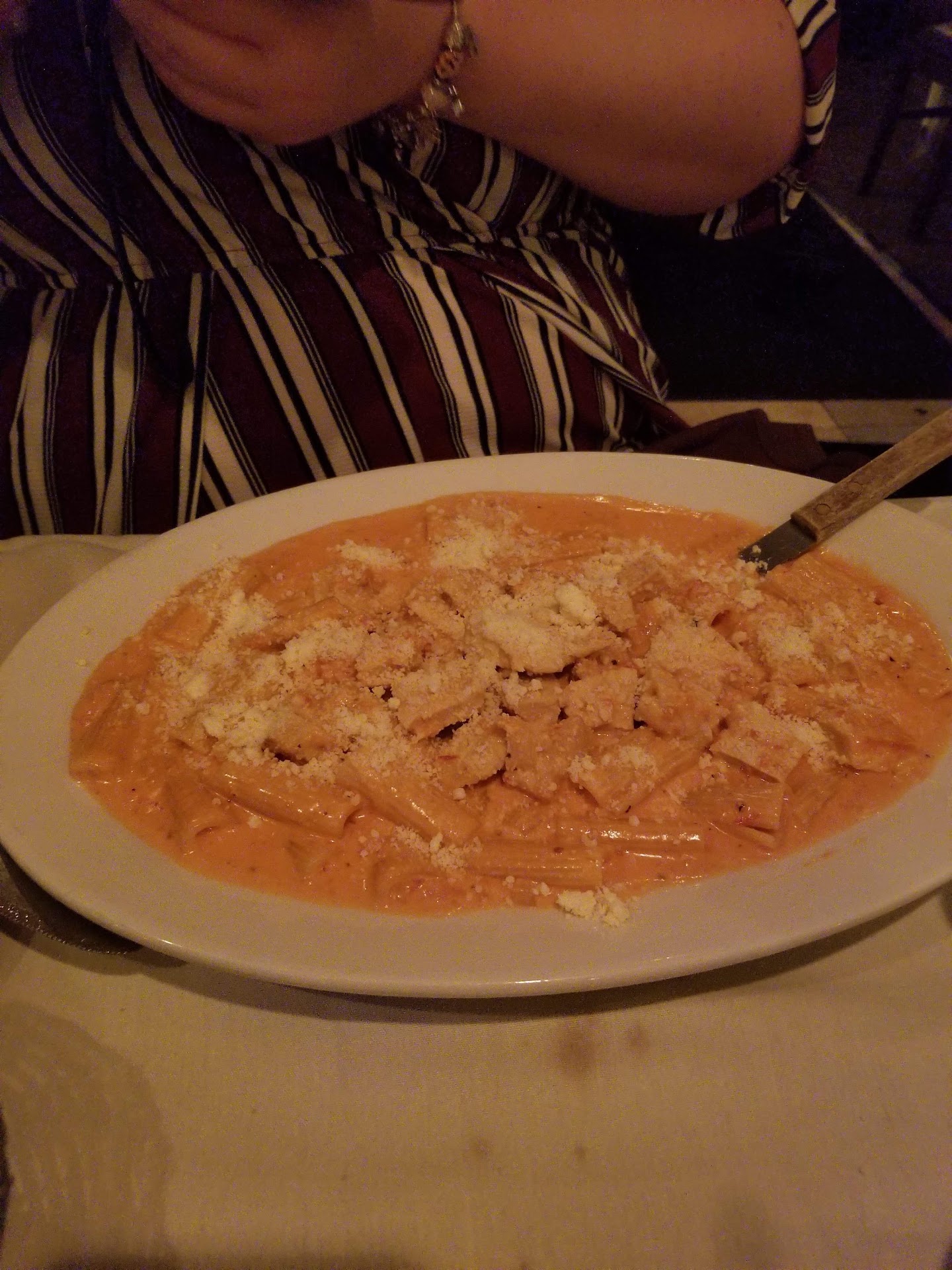 Food, best of you don't ask. My entree was okay, but I ordered a side on brocolli rabe. If something could taste like it was canned this us it and the menu treated it like a rarity with an MP for the price. My wife had the chicken piccatte, you know, chicken in a lemon butter sauce. Except there was no lemon taste, no butter taste. The sauce tasted like a can of chicken gravy that you would find on the shelves of a dollar general store. My father in law (fil) had a shrimp dish that was simply awful. I tried a piece of his shrimp and now I'm worried about my health because it was actually mushy in my mouth. Shrimp ain't supposed to taste like plain Jane oatmeal.