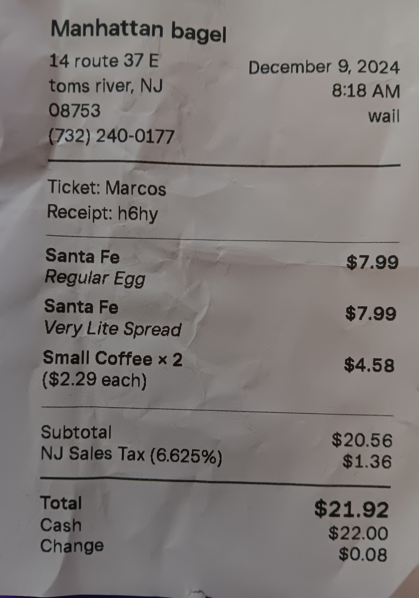 Read moreSuper Poor Customer Service, ordered 3 chicken salad wraps and was given hot chicken wraps. food was brought back to work and everyone started eating prior to realizing, since we were starving. called and manager could not care less. she said that since the food was partially eaten that there was nothing they could do. my work location will no longer purchase from this location, and my family and I will not purchase from any manhattan bagel every again. It's a shame, and I even gave the manager a chance to do the right thing. She got nasty. end of story. Poor show Manhattan...