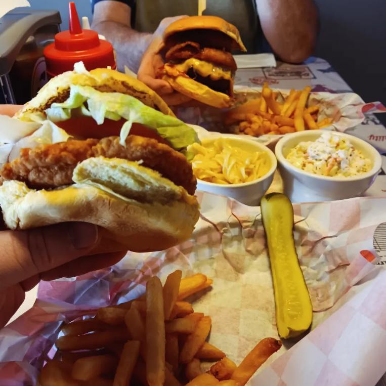In the first pic, closest to the camera is their Chicken Filet sandwich, which is breaded chicken breast with lettuce, tomato, and onion on a soft, toasted roll. It comes with fries and a pickle for $12. Very delicious. I did not add any mayo or BBQ sauce. Second pic shows their Sweet Burger, super-thick, super-juicy (ordered medium rare), with onion rings, cheddar and BBQ sauce. With fries and a pickle for $14.