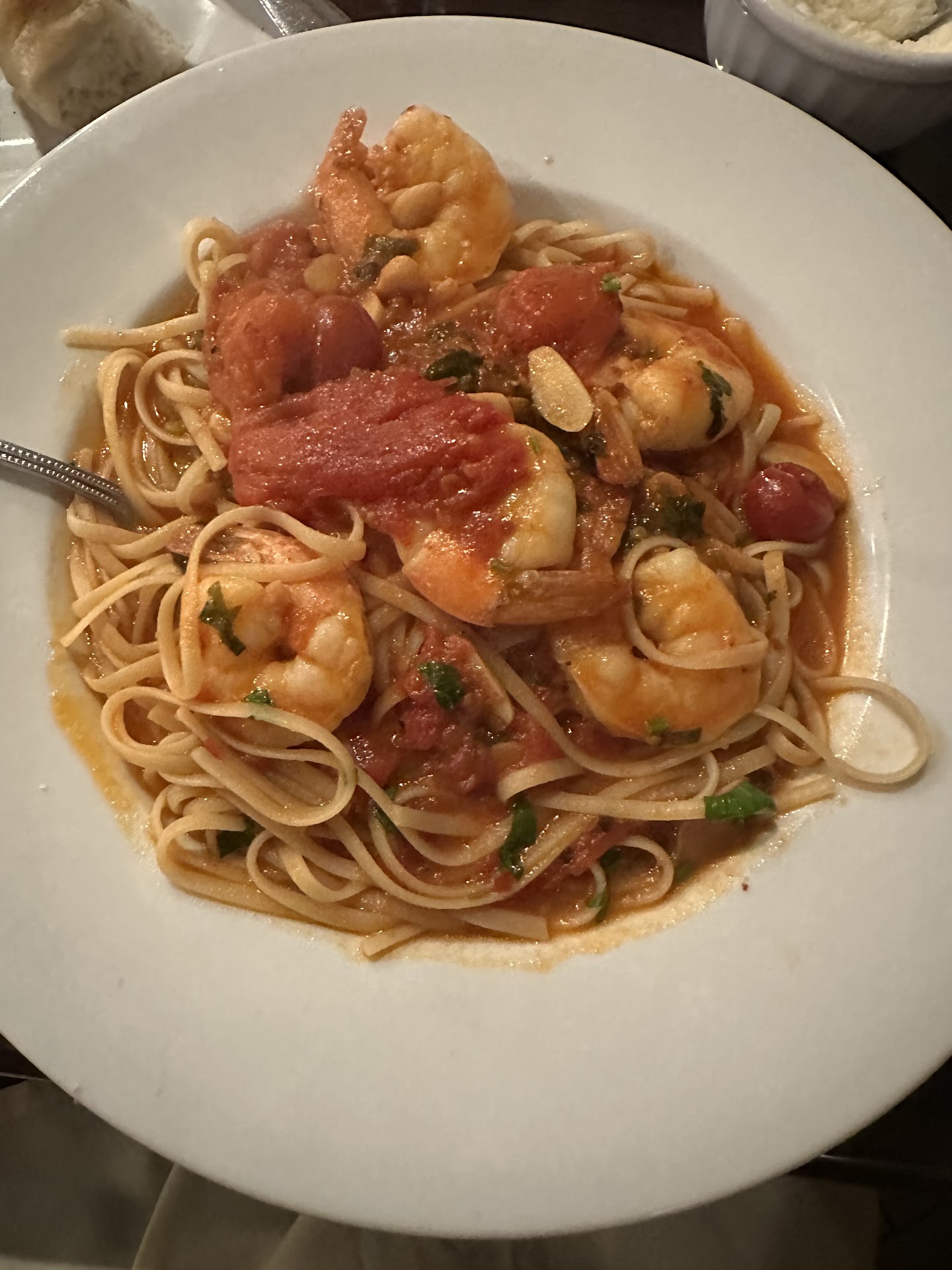 Having said all of that, the service was great, the food was delicious. My mother always hesitates ordering veal parmigiana out because she is afraid the meat won't be tender but she said it was so tender and delicious. She barely usually eats much, but she ate a whole half of the gigantic portion they gave her and the other half the next night. My shrimp scampi was delicious. I made a dish out of the leftover linguine the next night and it remained delicious. The salad was very good too - real greens, not the iceberg lettuce kind of salad.