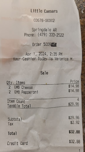 Read moreWalked in girl at the front sat on her chair in the back and just stared at me she then decided to get up. I asked if they had 5 dollar pizzas still she said no that’s fine. I told her my order and could barely hear her talking. She gave me my receipt and said it’ll be about 10-18 or 8-10 minutes idk I couldn’t hear her. Then I watched them make the pizzas with their bare hands I don’t know if little Caesar’s requires them to wear gloves when assembling but that’s honestly kinda gross. Also no uniform or anything resembling work clothes they are both wearing pajamas? Not ever...