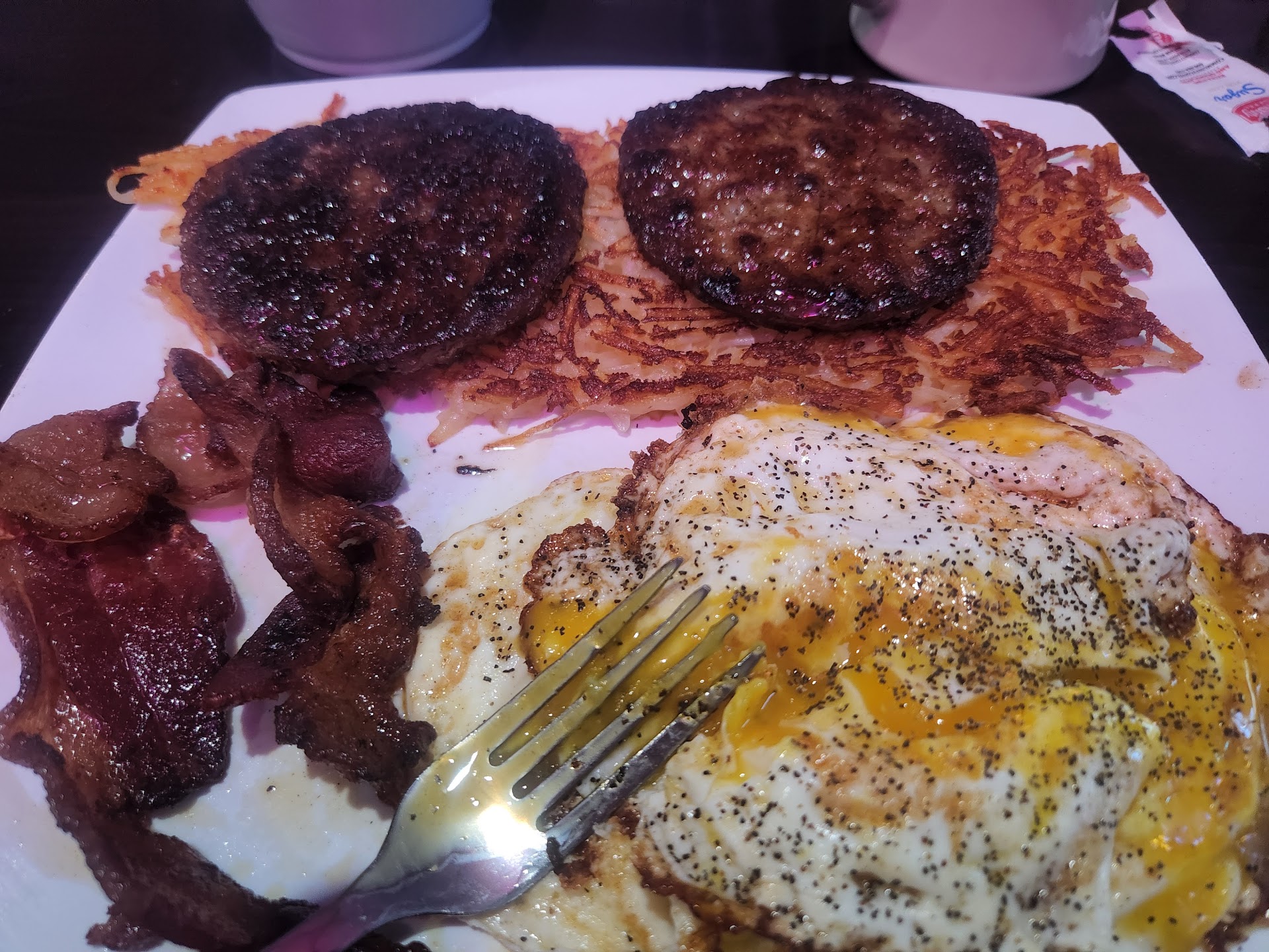 Ā Ā Ā Read moreThis was my second time trying breakfast here. This time I opted for a standard over medium eggs, with bacon š„, sausage, hashbrowns, with a side of sausage gravy. I really didn't want to say anything since this was free and took a little while for it to get done. But as you can see the one sausage is pretty black. For my tastes the sausage and bacon had a nice flavor, but for me the bacon is a little salty ( I understand it's a personal taste). The hashbrowns were about perfect, nice and crispy. The gravy ad a nice flavor too. The eggs were done nicely except pretty crispy around the edges as you can see. The waitress/bartender was pleasant and was working by herself so at times when it got busy she was having try to be attentive to about 20 or so patrons. This breakfast was better than the last one, but I may stick to eating lunch or dinner here. Everything I've had then has been...
