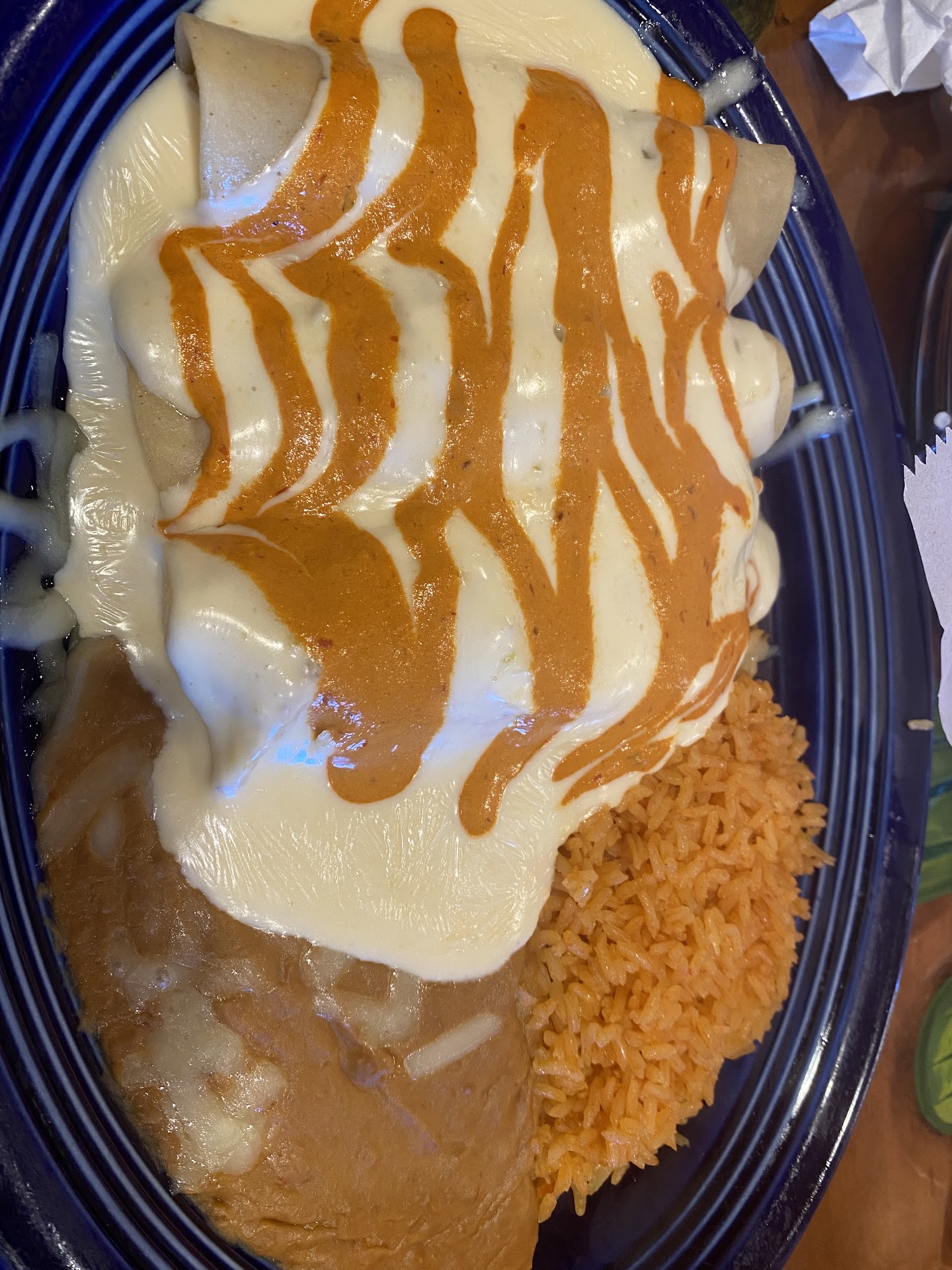 Main dish was okay. The chicken was a little on the salty side, but not terrible. Refried beans were typical. I wasn't fond of the rice. Somewhat flavorless and what flavor it did have wasn't that pleasant.