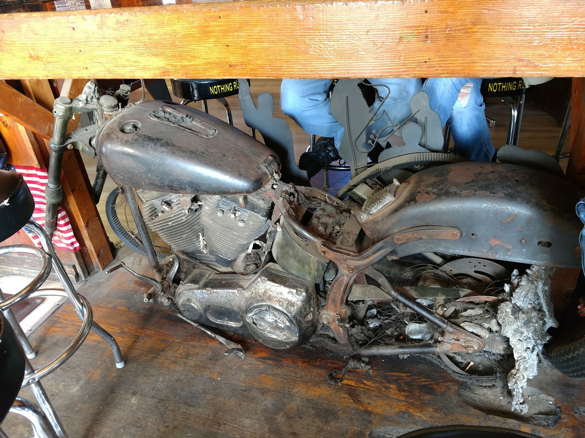 Love the old school feel of a American Classic Biker Bar. It is now, nothing like that. At All! Still has the bra's on the ceiling, signed dollars from travelers all around, an most importantly the Historical Motorcycle made of Bones in it's safe enclosure behind the glass Wall. The "Not made in America" motorcycles hanging in the trees on the property , an the Old bus parked out back where the outside deck is located for live entertainment. All that kinda washes away when you walk in an the bartenders act like they don't see you an a man in a dress is singing karaoke to music your grandmother would never approve. So I personally won't go back an I don't recommend to someone passing through thinking it's a Biker Bar.....Well, cuz now...