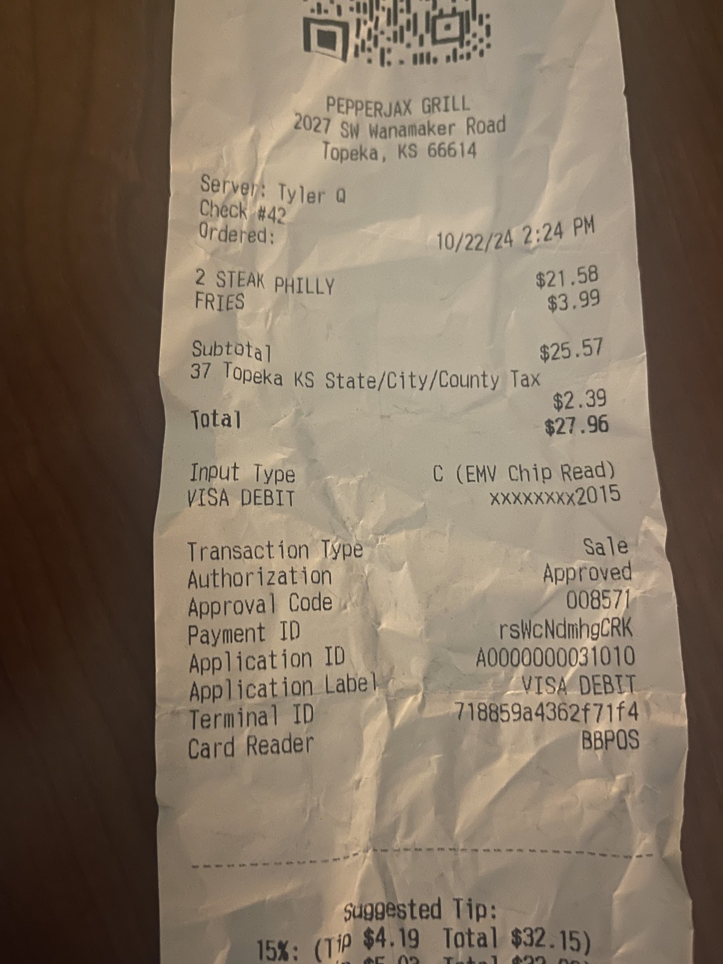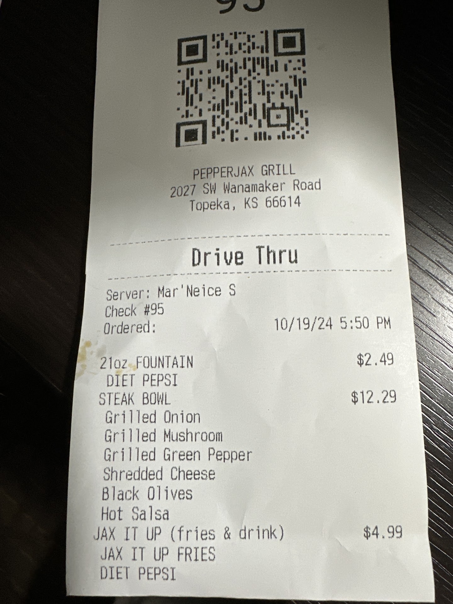 Read moreI have just finished eating a Philly cheesesteak with fries from PepperJax. A lot of people told me how good they were but I'm really not impressed. The Philly cheesesteak and Fries were really really salty. The customer service was somewhat fine. The reason I say somewhat fine is because as my sandwich was being made I asked one of the associates for extra cheese she said okay and proceeded to put that extra cheese on the sandwich. Another employee yelling at the top of her lungs stated there will be a $0.90 charge for each slice of cheese. I don't know about anyone else but I do not like when Food Service workers say things like that. I understand that you must let the customer know that there is an additional charge for the extra toppings. But I am pretty sure if someone asks for extra they already know that there is an additional charge. And the sad part about it is I was not at the cash register yet I was still in front of the grill. So I did not like this about PepperJax well might I say this experience. Also I did not like the environment because it was an extremely loud. Now if the food was satisfying I would not mind grabbing something to go but sitting in would not be an option for me because you would have to yell at the top of your lungs just to speak to the person sitting across the table from you. Thank you PepperJax for bringing something...