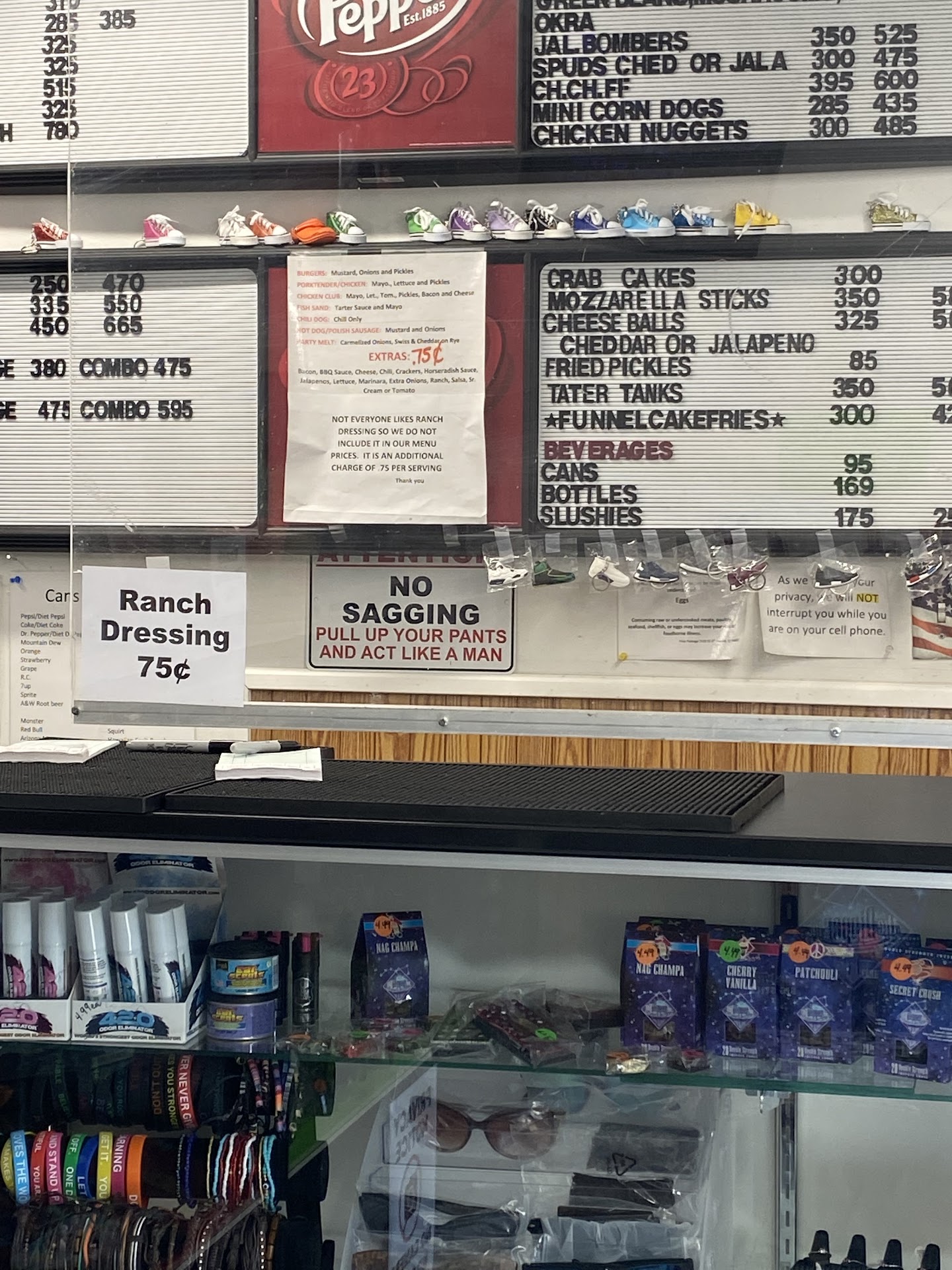 Harold’s Prize Package proudly has a “No Sagging: Pull Up Your Pants and Act like a Man” sign. This rhetoric is ridiculous, and I don’t even sag my pants. Spoon pipes, weed grinders, bongs, rolling papers, and dab rigs are sold at the front counter. It’s a bit strange and contrary to think sagged pants are still a concern, yet it’s acceptable to buy weed paraphernalia in a notoriously anti-medical/recreational cannabis state.