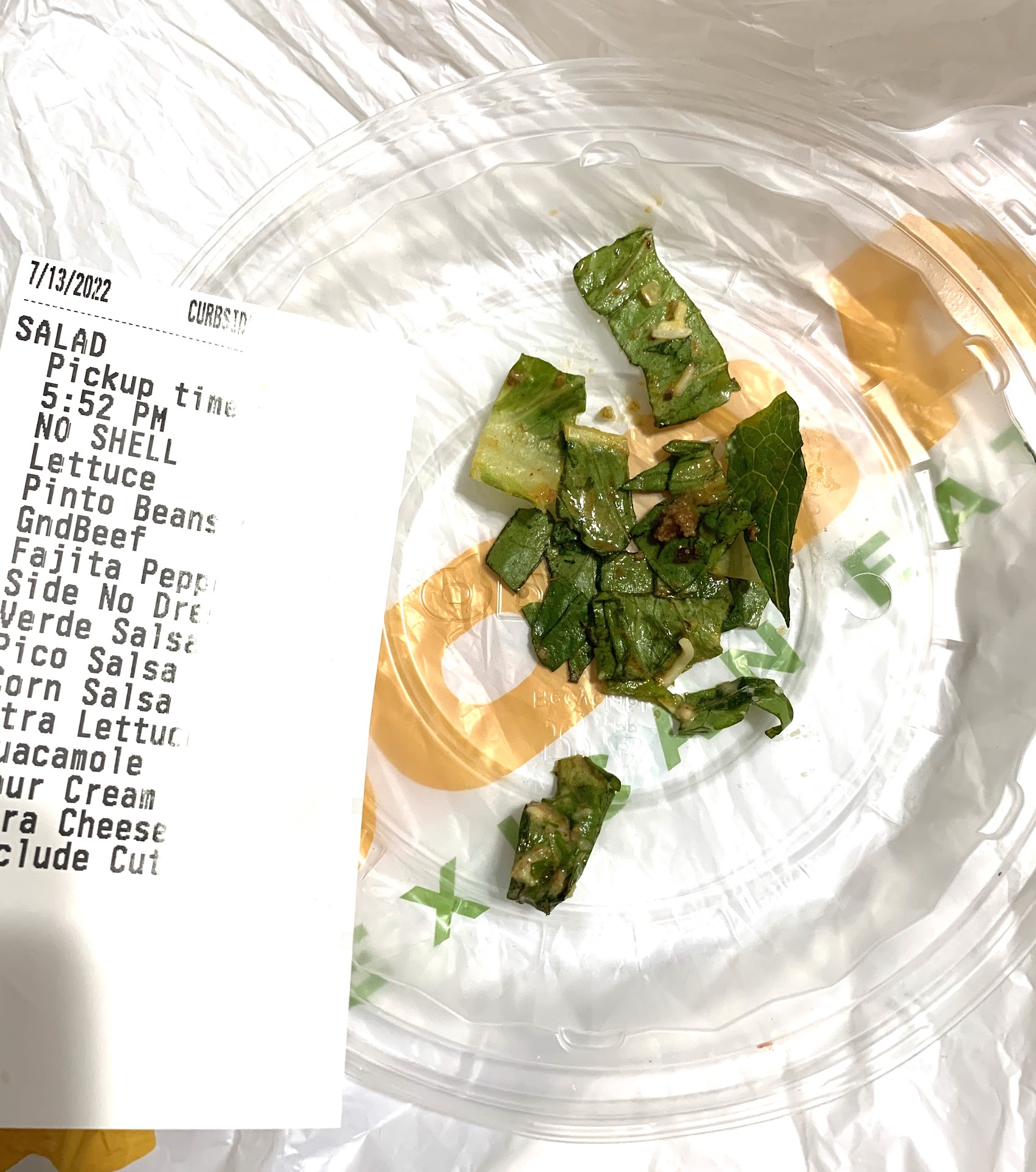 7/13/22 Haven’t been to Qdoba for 2 months. Gave it another try tonight, disappointing. I was craving a fresh crispy romaine taco salad. Minuscule amount of lettuce and I picked off about 1/3 because it was limp, wilted, rotten. You know how lettuce past its prime gets... slimy, folded over and stuck to itself, see pic. Not one fajita onion, just a few limp, slimy green peppers that aren’t even really green. What a waste of $10.
