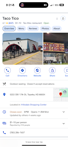 Read moreI'm redoing my review on this Taco Tico location . I went there yesterday and had a very pleasant experience. Everyone seemed in a good mood from customers to the employees. I ordered the Taco Burger combo and added sour cream on my Taco Burger with an additional Taco Burger made the same way and as always they are super delicious and addictive. The combo came with a crispy Taco which I smothered in mild sauce and a Bean Toastada smothered in shredded cheese with lettuce and tomatoes which was also equally delicious. The employee who took my order was friendly and the atmosphere was comfortable. The only thing I wish this Taco Tico would address is their somewhat wobbly tables. I love that they have Coke Products,( my mom loves their Cherry Coke Option), and the service is amazing even when they're busy. The taste of their beef in the Tacos, Taco Burgers and other items can't be beat. You have to give this place a try when in Topeka, Ks. I hope to make it to a Taco...