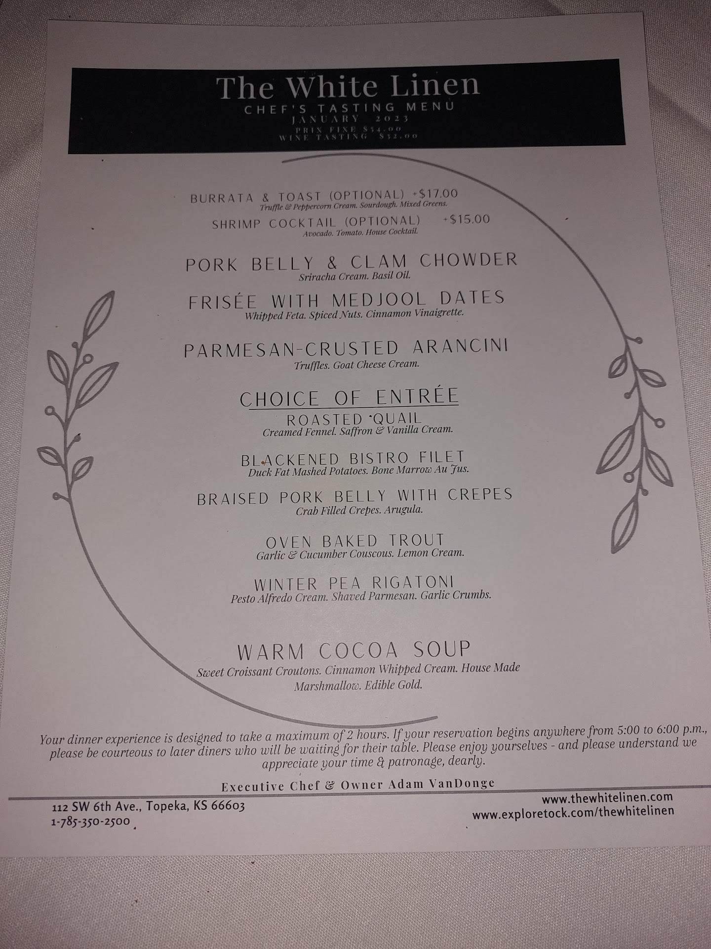 Read moreExcellent experience. Course 1, The charcuterie board was a wonderful way to start the meal, generous portions and a varied selection. Course 2, Caesar salad was good, but I feel the wedge style salad is becoming dated. Course 3, The cauliflower soup was velvety and filled with flavor of fresh cauliflower, I like the mineral notes that the micro greens added. Course 4, beef tenderloin was cooked to a perfect med-rare. The creamed leaks were delightfully tender and delicious, however, very rich. The crab topper extended the depth of flavor and continued the decadent vibe of the course. The Cajun cream sauce had a nice spice note that helped to cut the over-the-top richness of the dish, again micro greens were utilized to add an earthy mineral note. I had a vodka martini around the third course and found it thoughtfully mixed, the preparation, well executed. Overall this was an exceptional meal, albeit erring on the side of richness and excessive decadence. To provide a personal critique. My palette is unique, as are all, I would have liked some component of acidity to cut the overwhelmingly creamy and fatty elements of the...