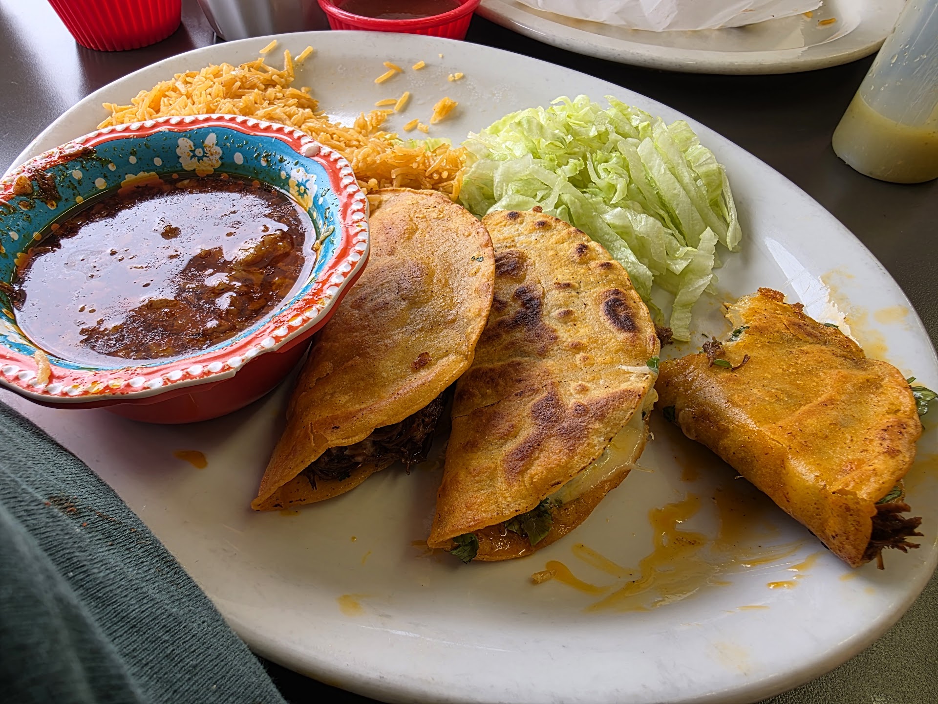 This place is a true Mexican food experience. I had quesa birria tacos (made with goat!), a Friday only special. This is the only place I know in Topeka where goat birria is served and the consumé(dipping broth) is over flowing with another tacos worth of goat meat. So delicious! The tacos were chared to perfection. The 3 salsas(mild red, med green, hot orange) offered are all individually fantastic and I found my favorite to be a mix of the hot and mild.