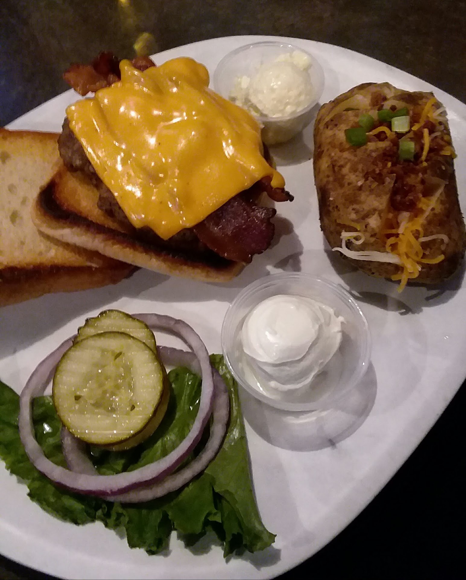 Read moreI went here to eat with a friend. The food was amost great. I had a stange combination of a cheese burger and a loaded baked potatoe, which is awesome. We should have that option everywhere. The burger was great. Perfectly cooked and a fair amount of bacon. The Ciabatta bun was a little tough, but it's not my preferred bread for a burger anyway (better for sandwiches). My only real complaint comes down to the baked potatoe. Now, I realized when I ordered it, that it would take more time, but I was in no hurry so, time was no issue, but when it came, the potatoe, was still so hard, that I could hardly cut into it. It was way, way undercooked. I ate what I could of it anyway, as I felt partially to blame, for ordering something that takes a while to cook (even in the microwave), but I really wish it had been better. Other than that, the bill was a little high, but not unreasonable, and the service rocked! The wait staff here are great! I'll give them another try soon, and hopefully be able tto update...