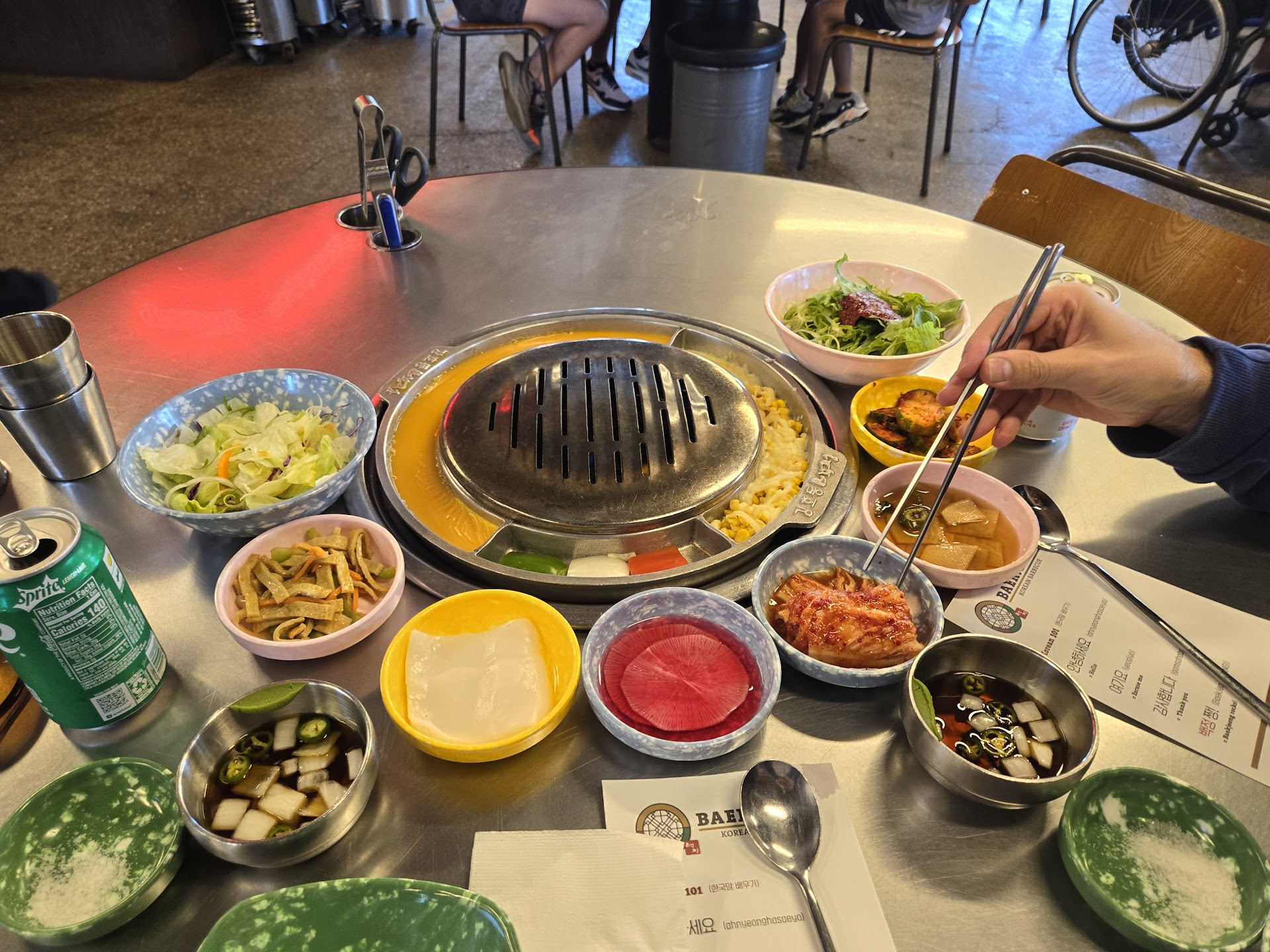 Your table is prepped before you sit down... Prepped meaning all the K-ppetizers; pickled & spiced veggies, 3 kinds of salad, meat dipping sauce, and a cold white soup in front of a BBQ grill with a fancy retractable air exhaust system...the waiter(s) cooks for you and adds extra items around the grill (in 3 separate crevices around the grill) as your meats are cooking; pieces of onions and green & red bell peppers, scramble eggs, and creamed corn (corn with cheese on top).