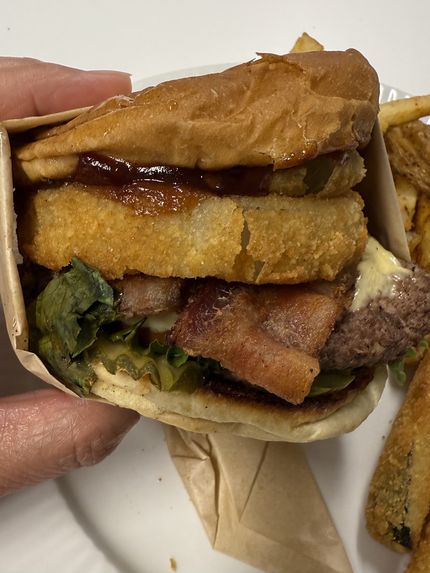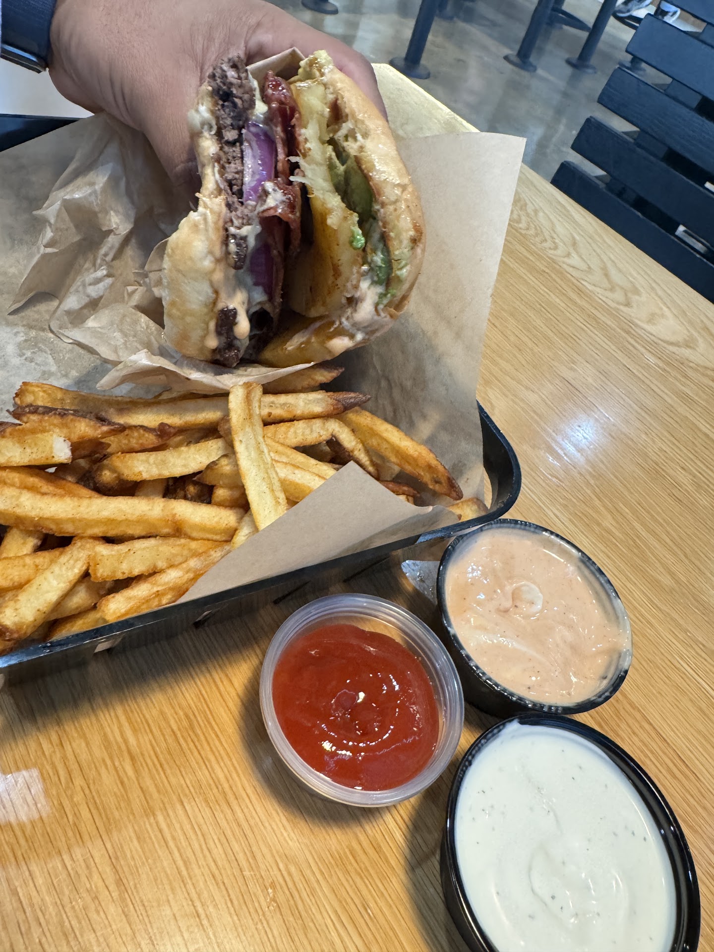 Food Order: #8 City Slicker (bacon, bbq sauce, swiss cheese, spread; added lettuce, tomato, pickles, grilled onions, avocado for $3) Combo with Zucchini Fries (sub for $2) & Fuze Raspberry Ices Tea $22.00 Fries $4.00