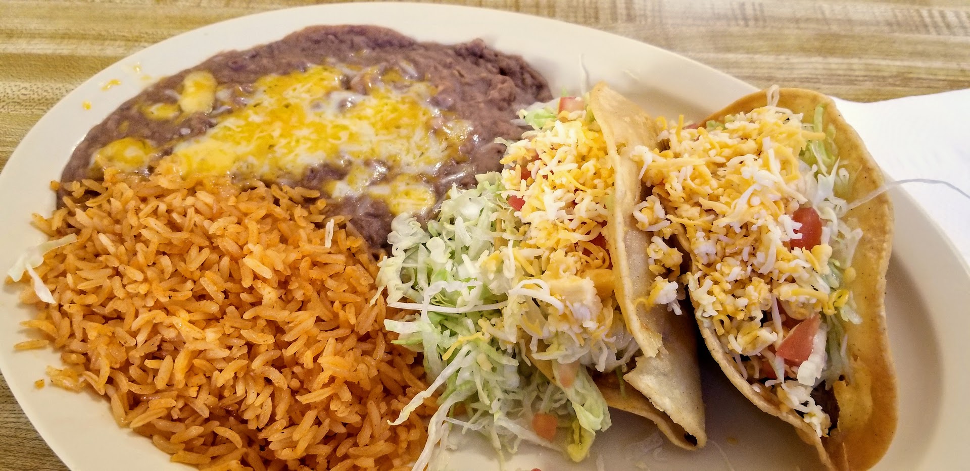 They have good food for a reasonable price only thing that is bad is their tacos the worst tacos I've ever had in my life. There was no flavor to the tacos I think they must have forgot to season the meat or something they were just so blah. Even with salsa on them it didn't help. And I know a couple of guys that are Mexican and they even say it's the worst tacos they've ever had they will never get tacos there again and I know other people my friends and stuff that don't like their tacos. But they're enchiladas cheese chips all their other food is very good and they have the best flan of any Mexican restaurant that I know. And especially 100% better than La Capillas Mexican restaurant in...