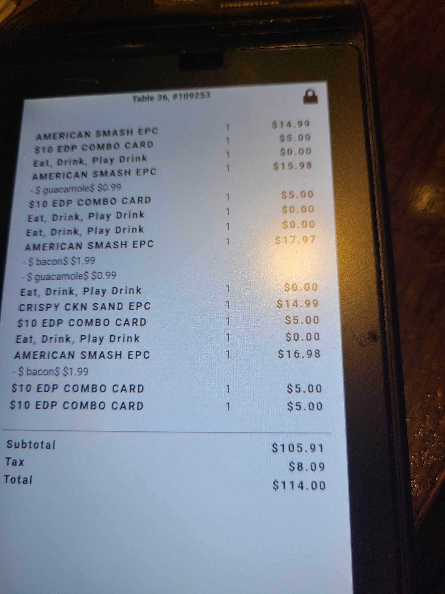 The cherry on top? Trying to pay the bill. We waited a full 30 minutes, watching Nate stand around at the bar pass, clearly avoiding us. My fiancé had to physically go tell him we wanted to pay, and even then, Nate stopped multiple times to do other things before finally coming over.
