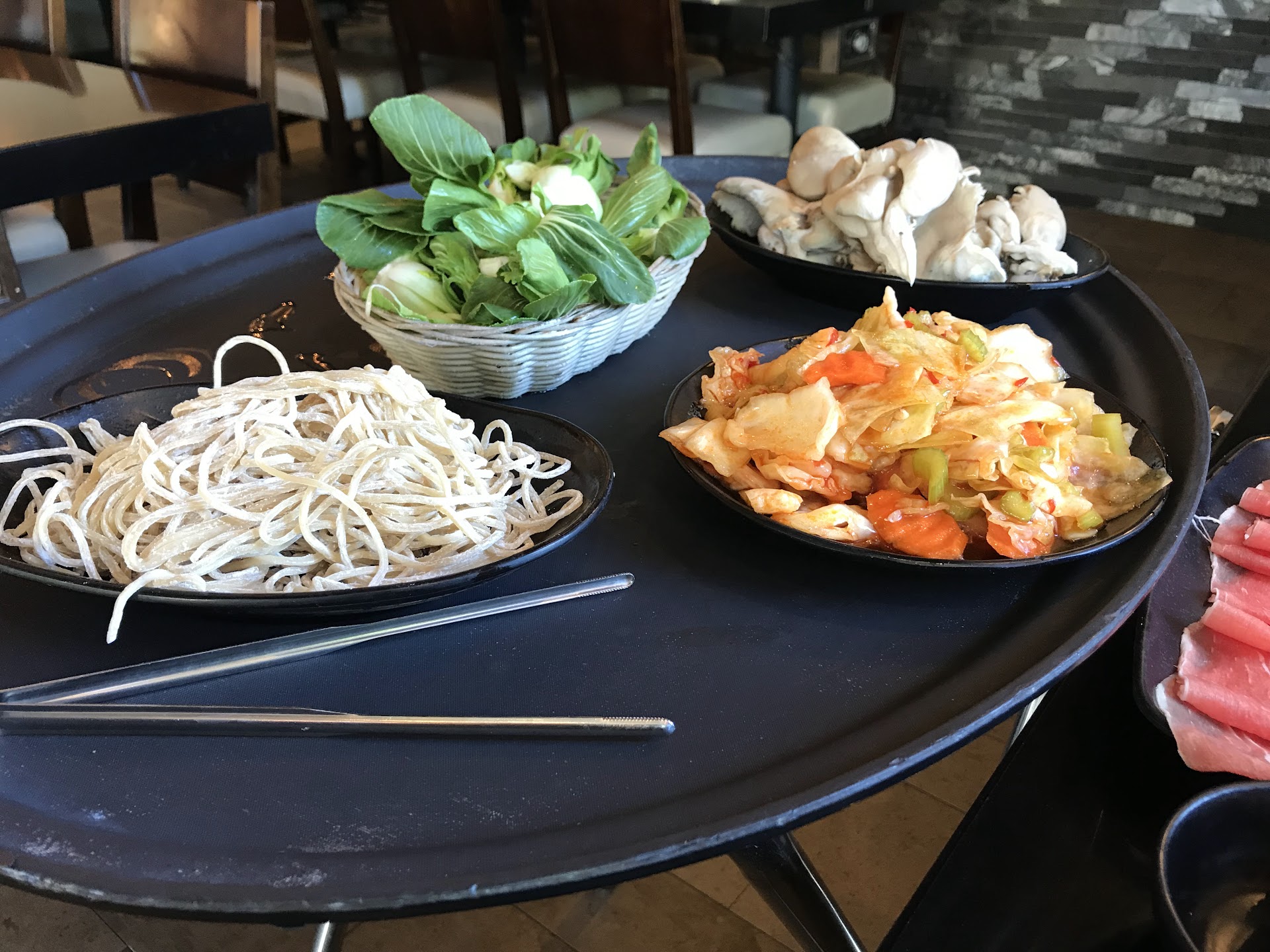 First thing you notice is the modem updated decor with wood tones and ambient lighting. The booths are quite comfy featuring a sleek black tabletop equipped with an induction grill. Perfect for digging in to a 2 hour plus meal. My eyes then centered in on the sauce station which had fried shrimp chips, sesame balls, cilantro, scallions, chili flakes, chili oil, sesame oil and even that Chinese bbq satay sauce just to name a few.