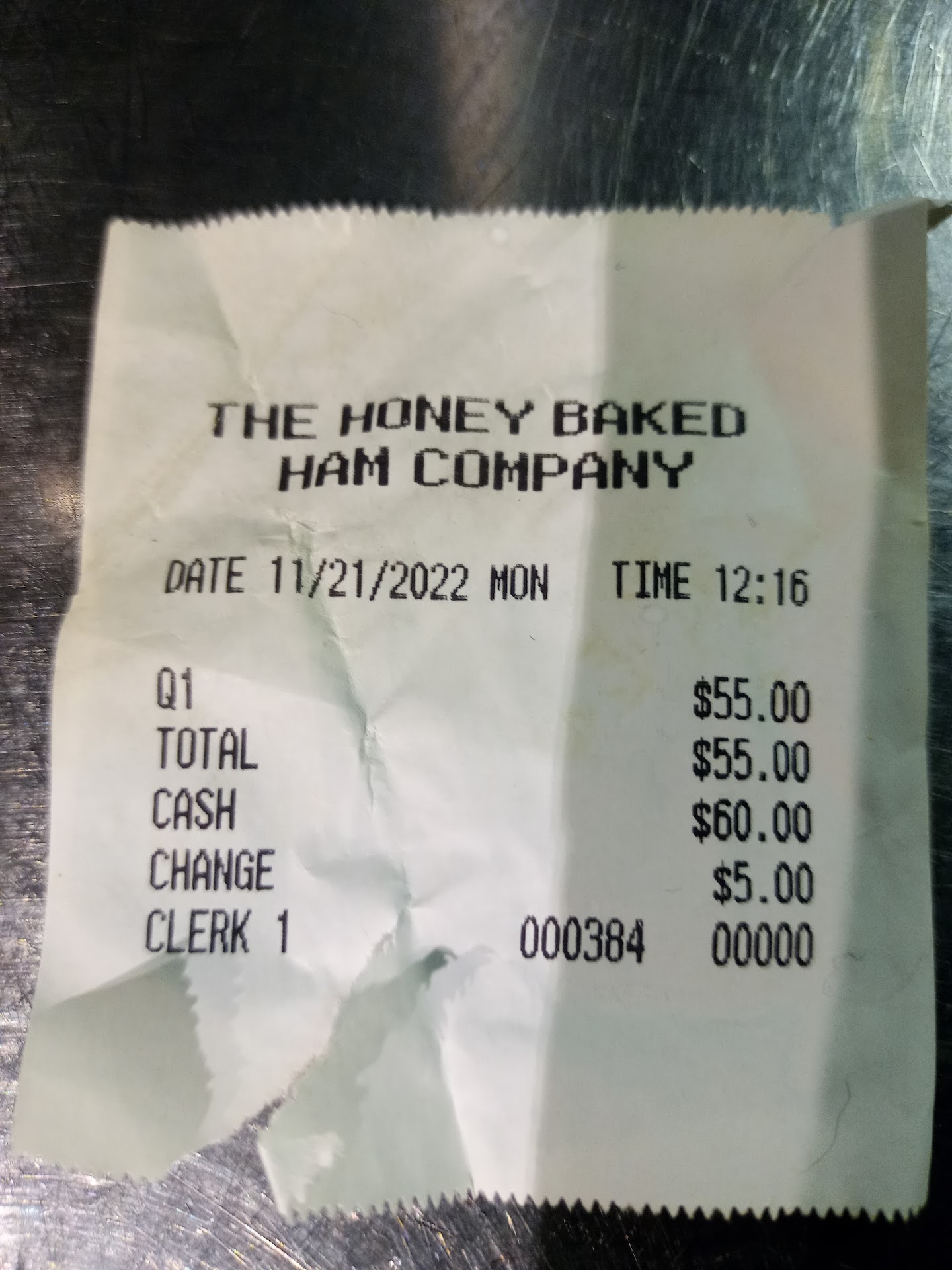 Ā Ā Ā Read moreI as so disappointed in this business. My husband picked up a holiday ham for our festivities today, and although the prices just keep going up, I can't fault them for this, because I was already aware of the situation, however, every time now we go in something has changed and not for the better. The last 2 times we were in the purchase for the holidays, buying only side dishes by themselves was not allowed I was told by the company. This year, they did have stuffing for a side dish, (which had always actually been my favorite part of the meal because it was fresh and tasty), but this year it came frozen in a cardboard box, and when heated tasted like something you would purchase from a convenience store that had been left in the freezer to long. As far as I'm concerned, we will not be making any further purchases from...