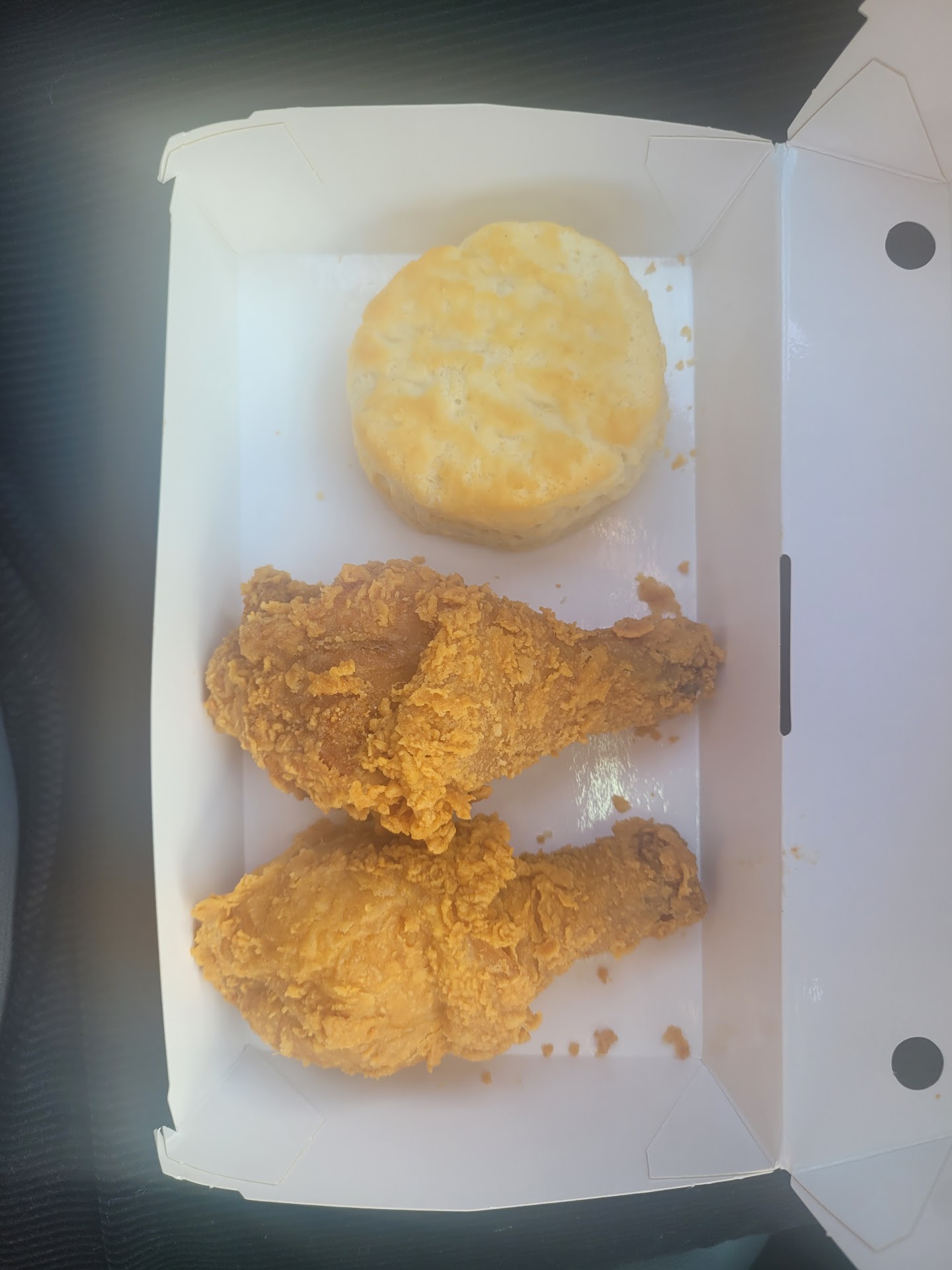 The chicken was crispy. Biscuit was OK. Nothing spectacular! The fries were decent. I got a side of mashed potatoes that I was not impressed with.