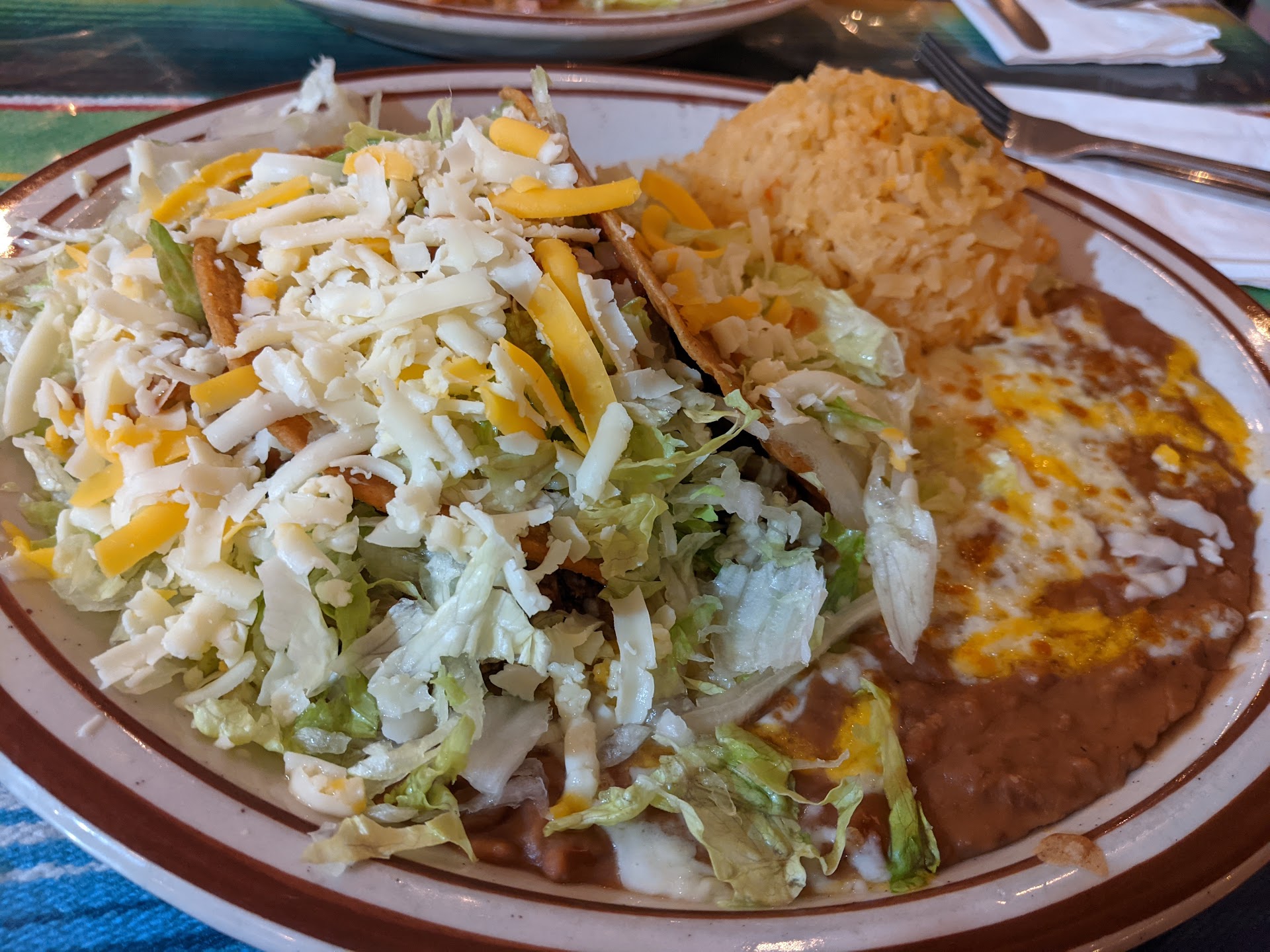 The tacos (I can't remember which meat I got) were nothing to write home about. The hard shell broke in half upon first bite, and it was easier to just eat it with a fork. The cheese and lettuce spilled out (I couldn't even see where one taco ended and the other began) and it was not a handheld food by any nature. Mediocre and certainly not legit Mexican tacos. The beans in the combo that I ordered were good.