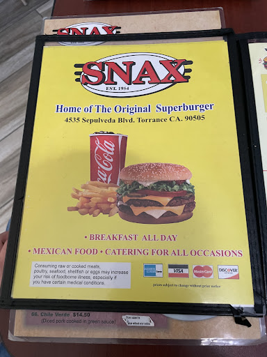 I treated a couple of my buddies to dinner at snax which was a favorite of one of my buddies ever since he was a child. Another buddy lives down the street and still goes their regularly! Great American food but they also have great Mexican food! Burritos are like small children. Massively big. If you eat it all you'll probably take a nap right at the table. My buddy had to take half of his home and he can eat! It was all good but they closed too early out the door by 8:30 p.m. on a Saturday night. Otherwise everything...