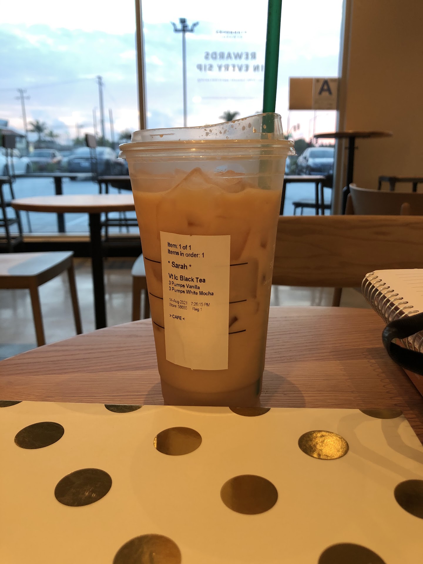 I ordered an iced chai tea latte with regular milk, petit vanilla bean scones, and also purchased an apple juice box.