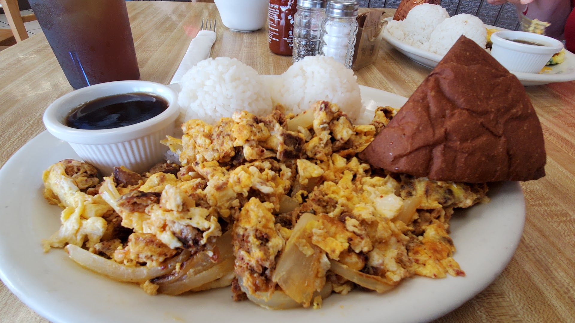 We ordered #9 The surfer Special. It came with homemade hash with corned beef, two eggs and Hawaiian sweet bread. Our second order was plate #f. It came with soicy teriyaki chicken macaroni salad and a plain wanton.