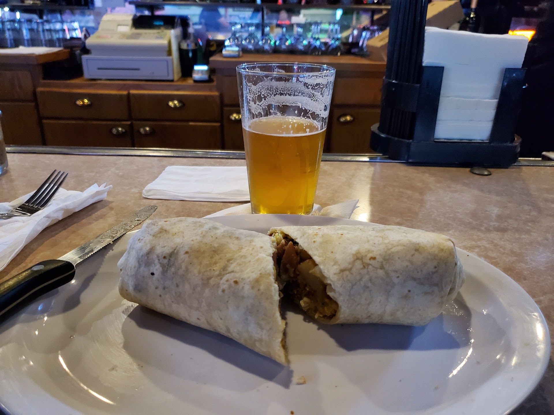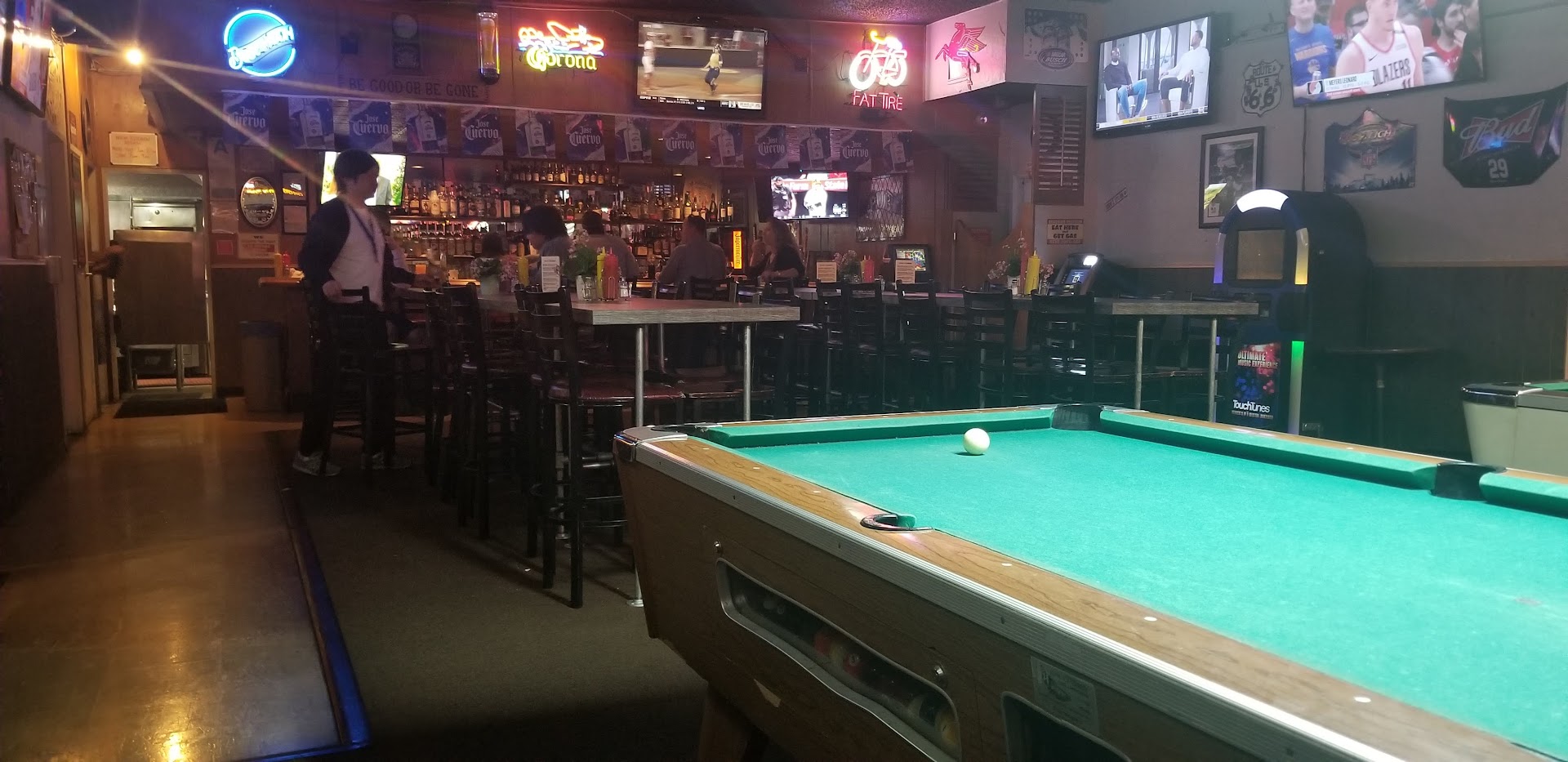 I enjoy playing Golden Tee (video golf) here but the focus of the Roadhouse is eating and drinking seated with friends and other multicultural patrons at the two long bar height tables boasting seating for 14 or more people each. You're welcome to express yourself loudly and with vigor here. They have many TVs for watching sports, a beloved activity here. They also have bar seating, a few bar height 2-person tables in vicinity to the gaming, and one 4-person table with traditional seating accommodating wheelchairs around. The gaming options are two pool tables, an electronic dart board, and the GT machine I mentioned earlier placed mostly out of the way of others. There's also a large outdoor area that's popular on warmer days or always...