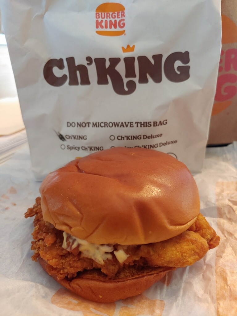 On the road again with no time to stop, my partner had to eat and decided to try the new Burger King Ch'KING chicken sandwich. BK says it's a hand-breaded chicken filet that comes with pickles on a potato bun in either a plain (classic) or spicy version. It has a mayonnaise based sauce on the bun. It's very similar to Chick-fil-A's well-known sandwich with crispy chicken and pickles but they butter their buns. The deluxe option leaves off the pickles and adds lettuce and tomato. It comes in a nice thick warming bag that some other places use. Overall, he said it's a good sized piece of chicken that is crunchy and moist and prefers the pickles to lettuce and tomato, better than many of the standard menu options from the three big chains and would get it again next time he's at a BK. With new entries coming out regularly, they're all worth a try if you eat fast food and are looking for improvement.
