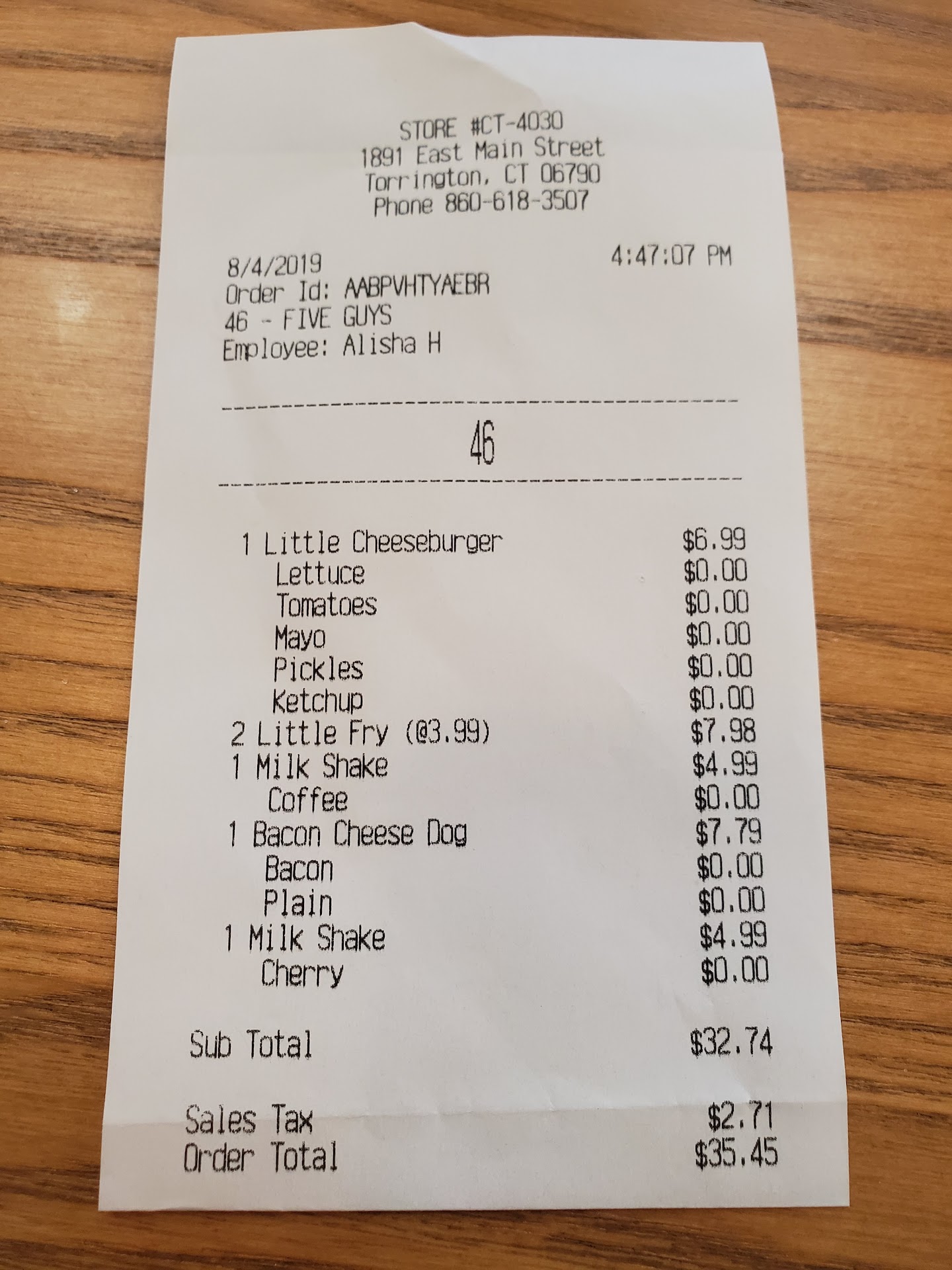 Really excited that a five guys opened in torrington, but then I tried it. The milkshake was the best thing we ordered. Burger was dry, bacon had no flavor, and bun was somehow stale even though they recently opened. Fries were the biggest disappointment. They were salty, soggy, and undercooked, no crispy fries to be found (which I didn't notice until I got home). Also really disappointed that they don't do what other locations do and put an extra scoop of fries in the bag. These fries were grossly overpriced for the amount we received. Food cost is extremely low for potatoes, they either need to lower prices or increase portions. Really hoping they get better with time, but I'd rather just drive to the Avon location, where I know the...