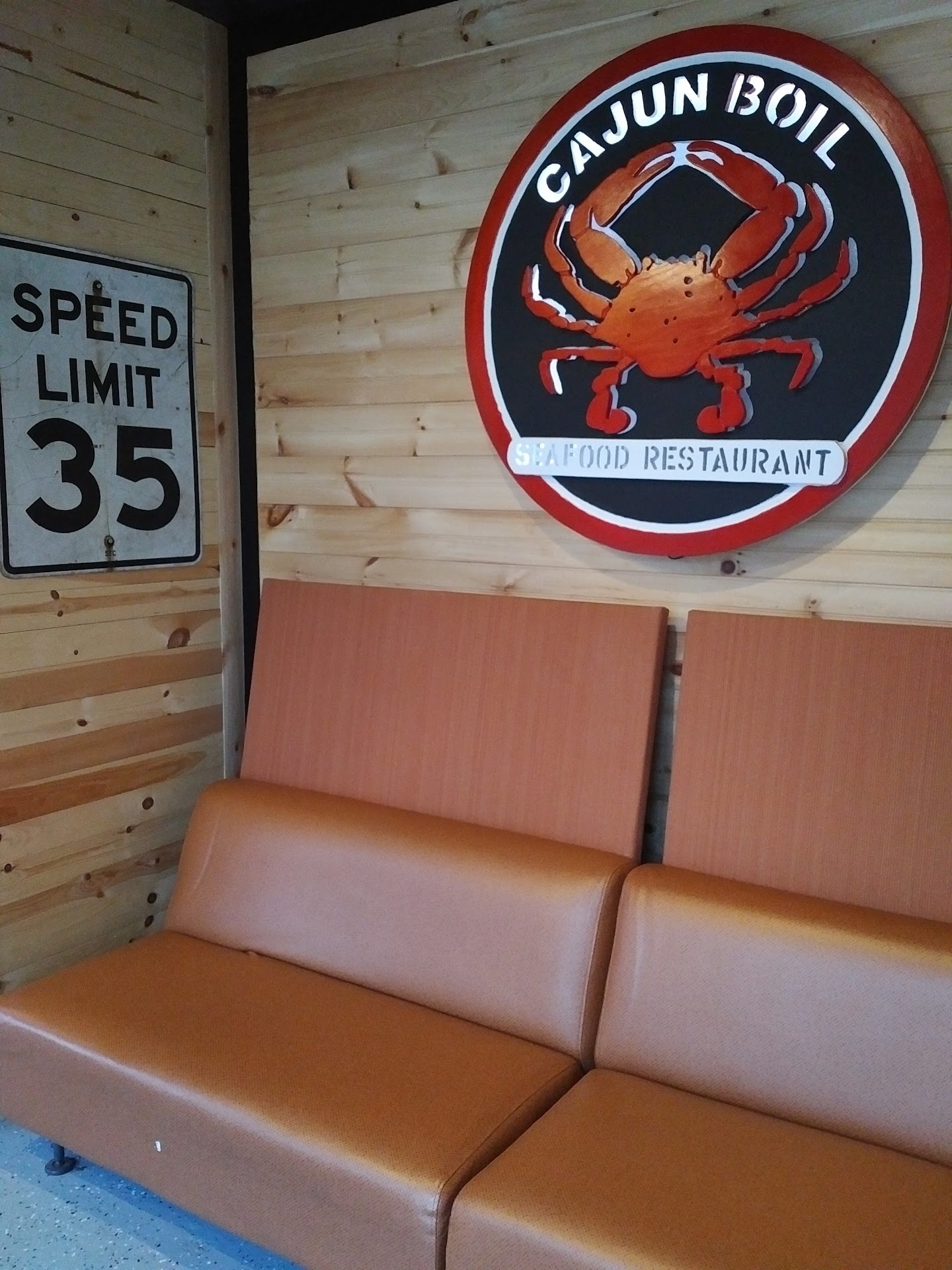 Visiting a friend opening a restaurant next door, we walked over to The Cajun Boil for a unique experience. Empty of customers aside from us, we loved the big space and design. The booth had surprisingly low bench seats.