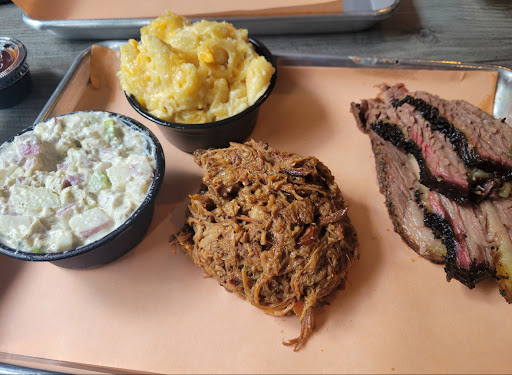 The potato salad was delicious, highly recommend. Creamy, flavorful with a nice hint of herbs. The Mac and cheese was also very good and was homemade. The pulled pork was very tasty although not very smokey. It was very tender and was the winner of the meats. The brisket was also tender but lacked a ton of flavor and smoke. As I see brisket as a bbq spots crowned jewel and a measure of their craft, thereโs room for improvement here.