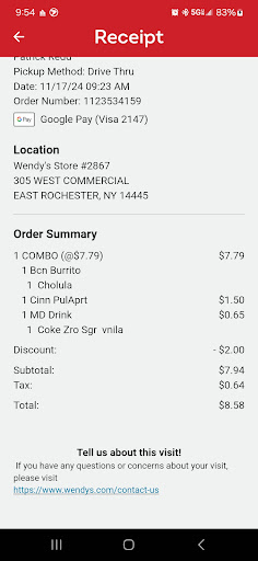 Read moreQuite possibly the worst Wendy's I have ever been to in my life. The people at the register did not even bother to change the sign to the breakfast menu. I ordered the honey butter chicken biscuit meal, and they charged me for the maple bacon meal. When I told them it was wrong, they told me it was the same price (it was not). I asked for it to be changed (the food was not served yet), and she told me she could just remove the bacon, but why couldn't they just change the sandwich out to the one that I wanted in the first place? I took the sandwich as is, with the bacon, which was black and overcooked. The fried chicken patty was oily and soggy. This made me question how old the food was, and it felt as if it was sitting around for a while. Further, when I went into the restroom, I was bombarded with a small swarm of flies in an empty bathroom. This truly makes me question the sanitary practices of this establishment, especially during...