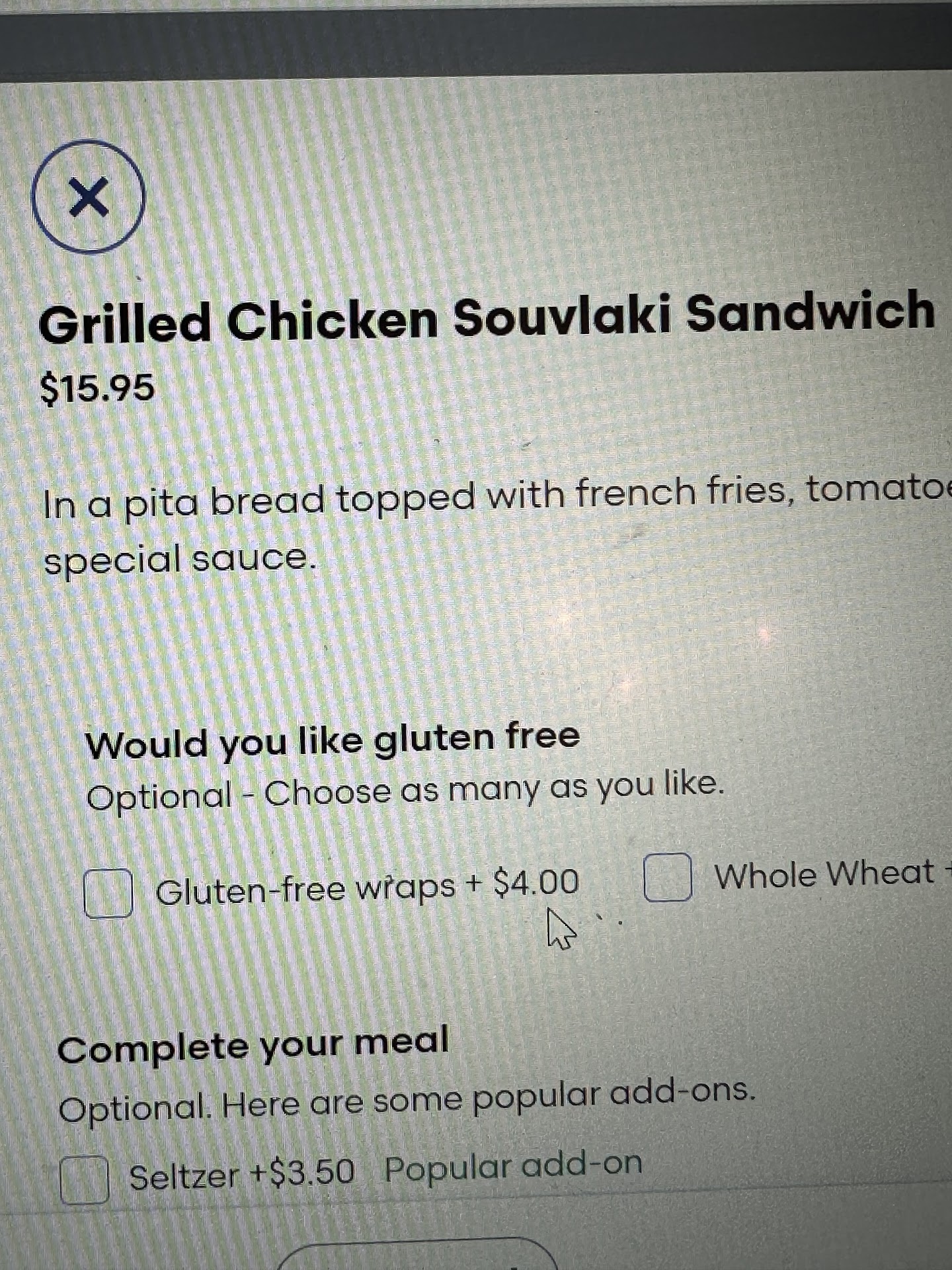 Ā Ā Ā Read moreItās ok if you donāt have allergies. I used to come here for takeout often, then last August when my order was messed up (I wrote no sauce/tzatziki due to my dairy allergy, and they put mustard on my gf wrap). I called to see if they can re-make it and they said I would have to pay for another. So I havenāt been back in months. I decided I would give it another shot and the gluten free wrap is $4ā¦ā¦ for an add on. Being gluten free isnāt a choice for me, and the owners have a son with allergies they should know how outrageous a $4 up charge is. Especially when new restaurants in town donāt charge for GF bread, and my favorite Greek spot in Westchester (not this one) doesnāt charge for the same GF Kontos Pita. Kinda sad I canāt get just grilled...