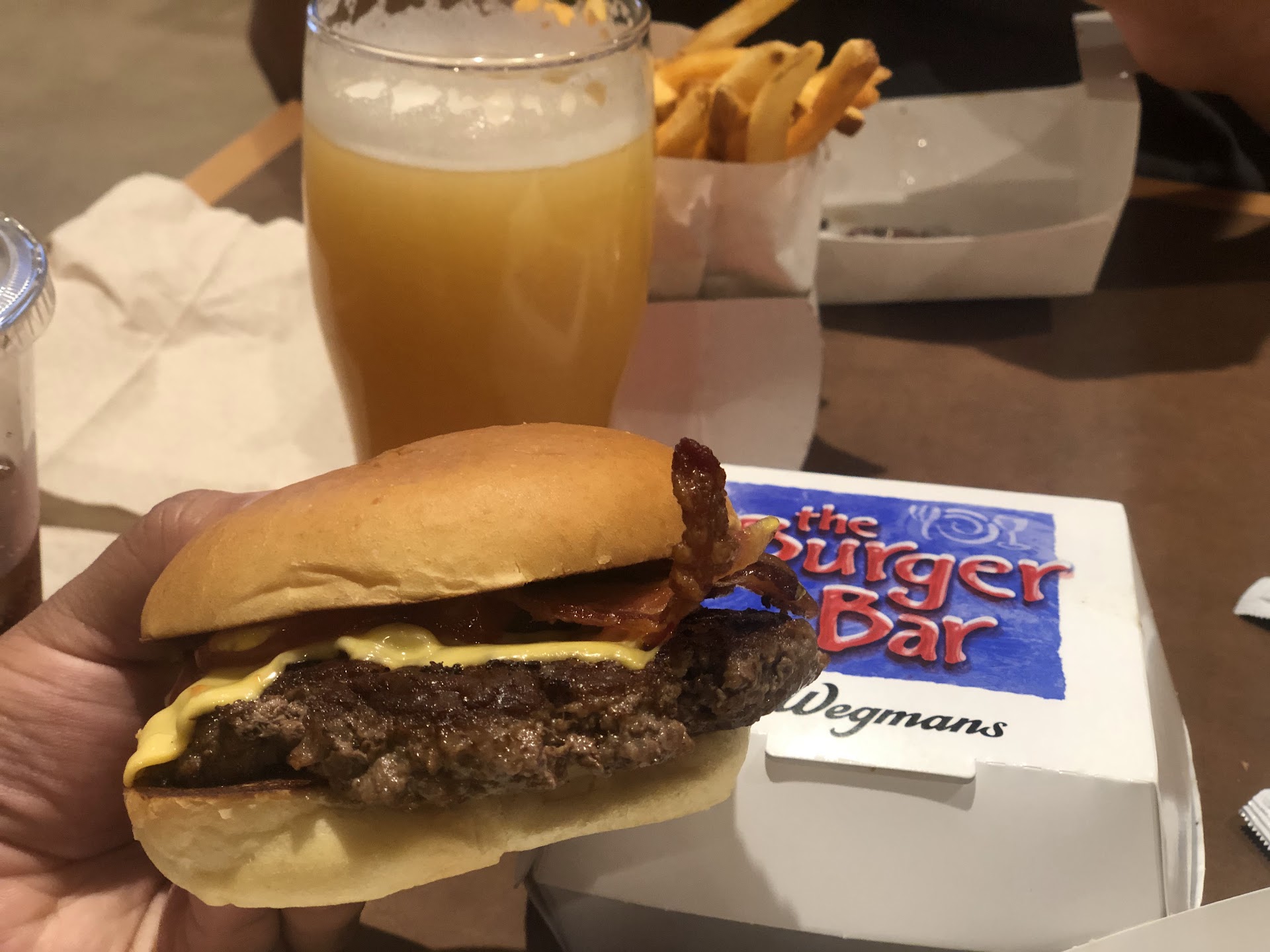 Wegmans overall has been a great experience and place for shopping. Their Burger Bar just adds to a good experience. The service reminds me of a mix between Shake Shack and Smash Burger. The burger itself was cooked well, and was delicious. The bun made it the entire meal even better. Their crispy fries were not greasy and lived up to their name, crispy. It was nice to order a local beer on tap, too. Plenty of indoor seating that was clean and well kept. Staff who took our order was super helpful and friendly. First time at the Burger Bar will not...