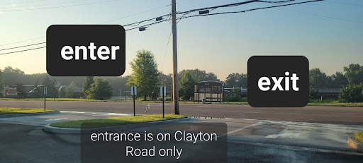 The only way to enter is from Clayton Road but you can exit onto Clayton Road and turn either direction or exit onto Ballas Road but Northbound only. No left turn (southbound) is permitted onto Ballas Road as this intersection gets pretty congested, especially during rush hour. They did a great job with the signage on this site to show drivers the traffic flow.