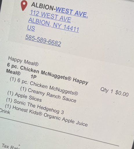 Read moreHard bun cheese not melted cold burger. Fries were ok. Special order incorrect accuracy of order always an issue. Decided to go back for 2 for 5. 8 months later on 1/9/19 I got 2 big macs horrible hard buns not even made right very little,mac sauce hardly any lettice and meat was dry and been sitting there totally discusted with albion location. Obviously by pist I'm reading it will never change I'll go down the street to burger king pay the extra dollar and get fresh hot food made. My way right away. 5/16/19 Well here is newest review got 2 10 piece nuggets they were old hard as hell on outside gummy on inside ordered a small fry at a high price in my opinion at 1.99 got bottom of bag and they were very old and stale tasting. Only good thing I got was a cold diet coke. Just a note tho I only went there again because my kid wanted mcdonalds. Still rather go down the street I know I'm getting...