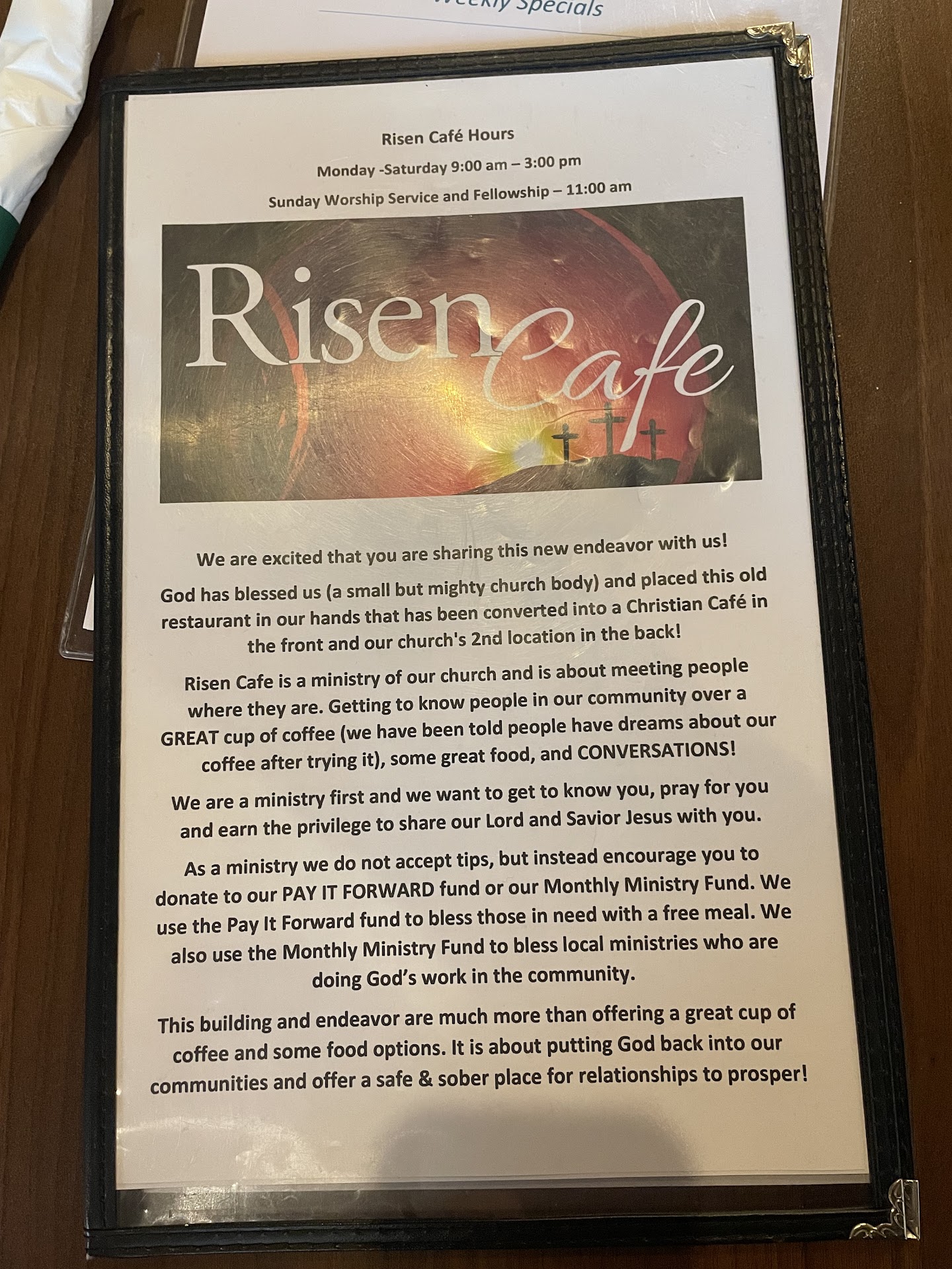 Today on a whim, I decided I would visit this cafe with my almost 2 year old son while waiting for our Wal-Mart pick up order. Iâve followed this place on Facebook since it opened but never made the time to go. Iâm so glad I did today! When I first pulled up there was someone standing at the entrance smoking. So I did another circle around the block and almost went to a different cafe in town and couldnât find parking so I circled back to Risen cafe. Now that the smoking individual was gone, my son and I parked out back and walked to the side entrance. We were greeted with a smile from who I found out to be a girl named Sara. She was super sweet and brought us a high chair and rearranged the table so the stuff was out of my sonâs reach. I love the atmosphere. People gathering and happily chatting. Every day people. The two girls up front, Sara and another blonde hair girl were smiling and friendly with each other and not gossiping. I love that the table had a prayer request paper we could write requests on. I also love that the story of the cafe was on the menu. The prices were affordable and the food was so delicious like I was eating a home made meal. The eggs werenât those restaurant kind of eggs but tasted home made. The home made sour dough bread was so good too! And I loved my ice coffee even though it was a little pricey at $6. I especially appreciated they mentioned no need to tip but instead donate to the ministry. And there was a little jar at the table to donate to the employees. But no pressure at all. And at the back of the store was a little display of the meals bought for others. I canât wait to be back and bring many other friends. I usually donât take my toddler but they treated him kindly and he was...