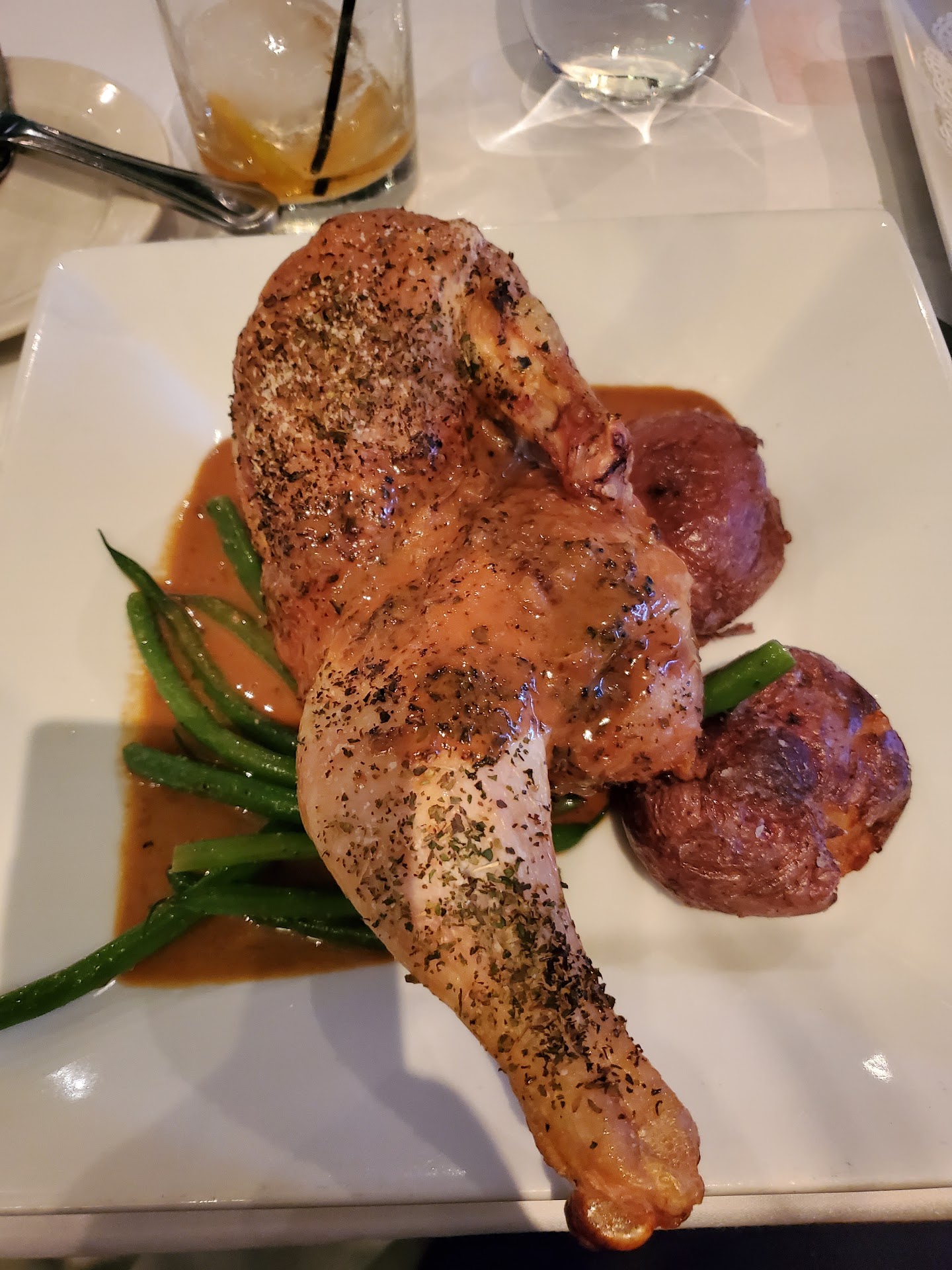 Read more800 Maple is a beautiful looking upscale restaurant, that falls a bit short of it's class. I say this because, I expect more from a upscale restaurant. When you look past the beautiful decor, you have to judge a place by their food/drinks. After carefully looking over the menu, my wife and I found it to be lackluster. My wife ended up getting the asparagus salad, and I ordered the roasted chicken. Initially, we did not place an order for a appetizer. But our waiter suggested that we should, just to help pass the time. Because the roasted chicken could take up to 30mins to prepare, so we ordered the truffle fries. While waiting for our food to arrive, our drinks was ready and was brought to us. Tai ordered the Cosmo, and I ordered the Manhattan. We were both disappointed by our drinks, because they both tasted watered down. By now our fries showed up, and the first thing we notice is the fries are lukewarm. We are starting to wonder, if these fries was just sitting under a heat lamp. The main entree's arrive, after about 20-25 mins wait time. I had no problem with that, I felt that was reasonable. Tai like her salad, but grew tired of it after several bites. I had tried some of her salad, and understood why she felt the way she did. You get a strong taste of boiled eggs in the salad, so if your not into boiled eggs. This may not be a salad you would want to try, or just omit the egg when ordering. My roasted chicken was huge, and the skin was nice and crispy. What I didn't care for, was the cognac peppercorn sauce. To me it tasted more like a foie gras sauce, than a peppercorn sauce. My final thoughts of this place would be this, the food is not on a upscale restaurant level. There is nothing exciting, bold or daring about the dishes. I feel this is a neighborhood favorite, that is better than Carrabba's, Scotch and sirloin, and Red lobster. But does not compare, to the upscale restaurants in the downtown...