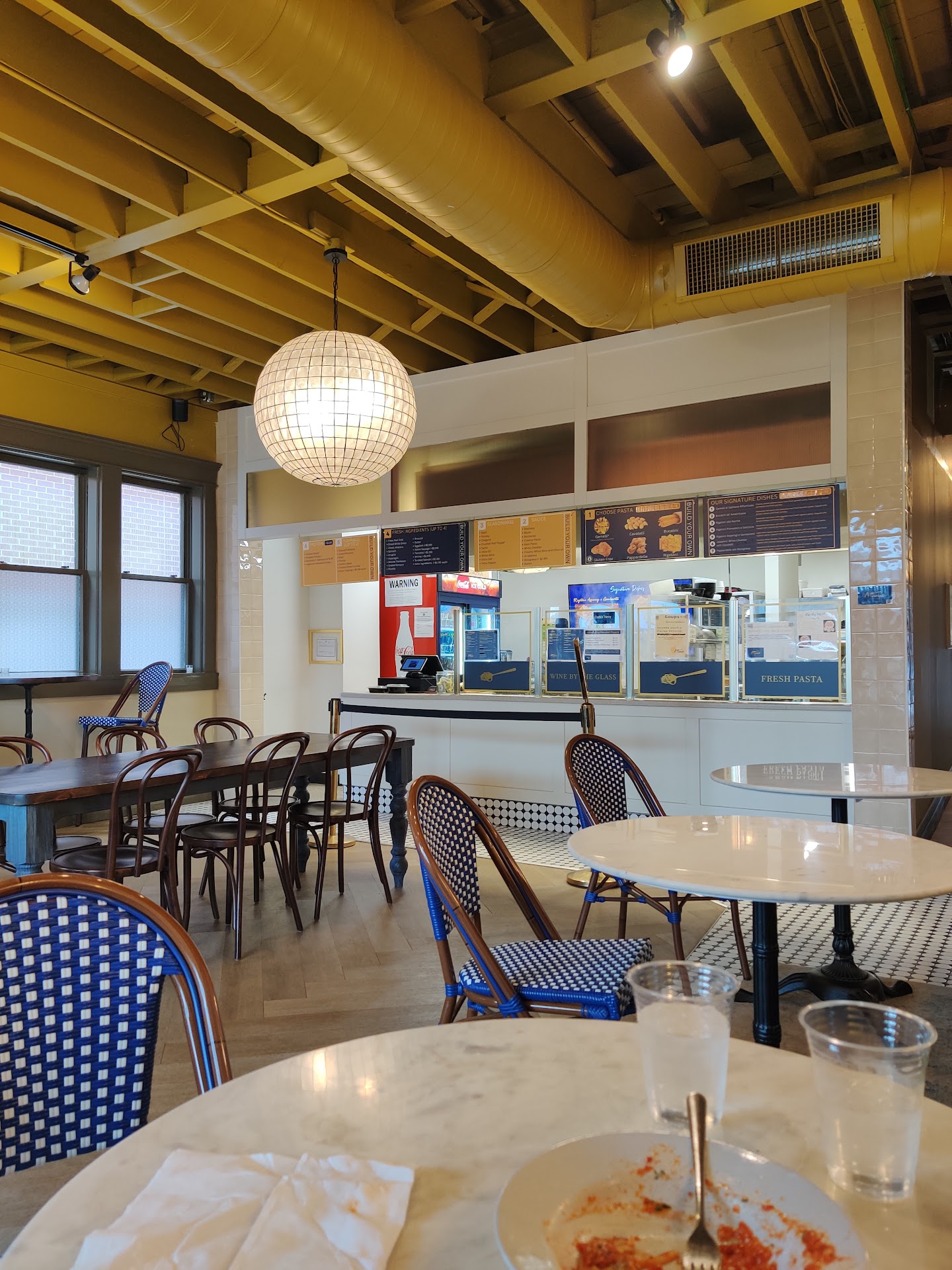 Great addition to the village! We stopped in for dinner a few months back and had an amazing experience. The staff could not have been more friendly and helpful in explaining the menu, both the items and the process, and when we visited after that it was the same experience. The setup of the restaurant is really neat, too. There are some high-too bar-like seating near the window which gives you a great view of Main Street, and then they are both tables with regular chairs and then a banquette style seating with chairs, as well. At the front counter where you order you can see the chefs making the pasta, and when you create your own they add the items fresh as you are ordering. When you walk through the back door there is a doorway or cutout that you can see back kitchen where they are making the homemade pasta fresh, which is cool too.