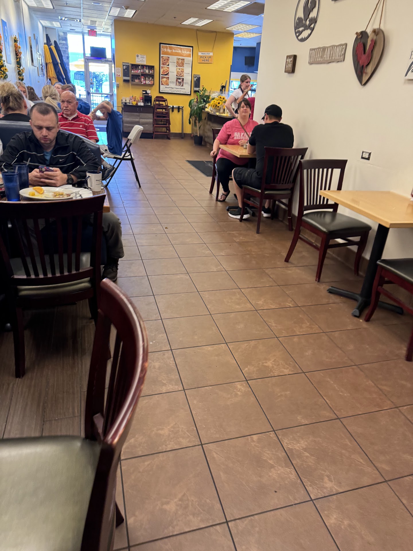 My son's pancakes were burnt. Didn't get any syrup and didn't see her again for 20 mins to get any. They ran out of the regular bread for French toast so my wife's french toast was more soggy. I had the corned beef hash which was OK but nothing like normal. Liquidity with watery eggs in it. When I mentioned food came out not together, I received my toast and my wife's sausage links after the 20 mins I mentioned.