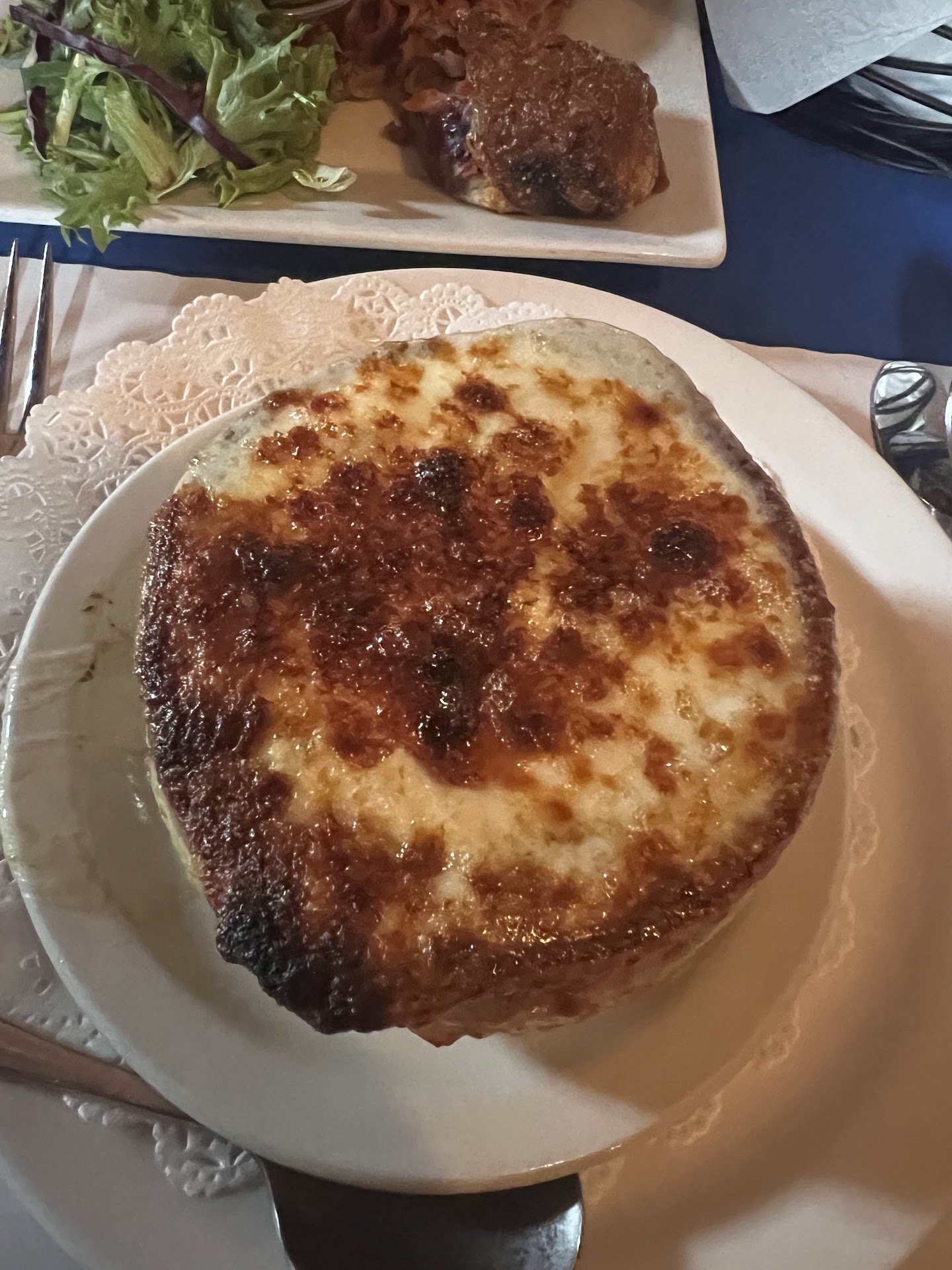 I've had the "French Onion au Gratin" soup twice at this point. Both times it was covered in a thick hard dry layer of cheese that is impossible to pierce with a spoon. It ends up being a soup with a cheese lid that you can either throw to the side or try swallowing whole if you can stomach it.