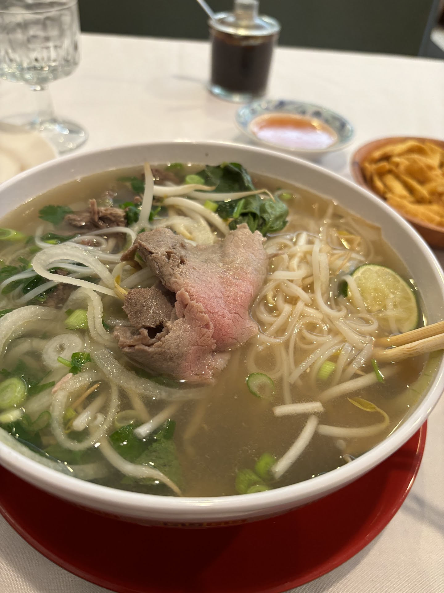 The good: It's always nice to eat where there are linen napkins & tablecloths, the restaurant was about 1/4 full and there was a lovely group of Asian people sitting at the large table adjacent to where I was sitting. The waiter came with a bowl of noodles, duck sauce and a pot of tea. I ordered the roast duck pho. The dish was really tasty, generous amount of noodles, nice clear broth but.......